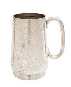 27. Seven silver napkin rings, a Christening mug, and a cocktail stirrer the napkin rings of various makers, dates and forms, with engine-turned and engraved decoration, the Christening mug, Birmingham 1923, with engraved initials, the cocktail stirrer marked 925, with a maple leaf form end (9), the mug height 7cm, total weight 6.97ozt