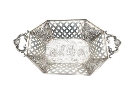 17. A German silver pierced dish Hanau-pseudo marks for Georg Roth & Co (1891-1919), of octagonal form, with alternating pierced and foliate repoussé sides, the base depicting a village scene with musicians playing for two dancers, width 35.5cm, height 6cm, 15.65ozt