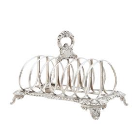35. A William IV silver toast rack by Edward, Edward Junior, John & William Barnard, London 1832, the handle with an engraved crest of a panther head, leading to six divisions, raised on a cast foliate base, width 18cm, depth 11.5cm, height 13.5cm, weight 13.26ozt