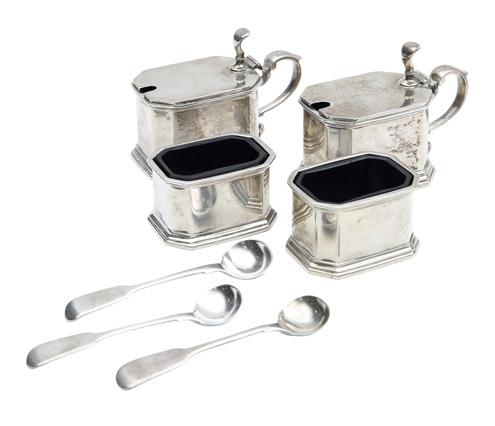 22. A George V silver four piece cruet set and spoons by S W Smith & Co, London 1913, comprising a pair of mustard pots, and a pair of salts, with three Victorian Fiddle pattern cruet spoons (7), mustard pot width 10cm, height 8cm, total weight 14.85ozt