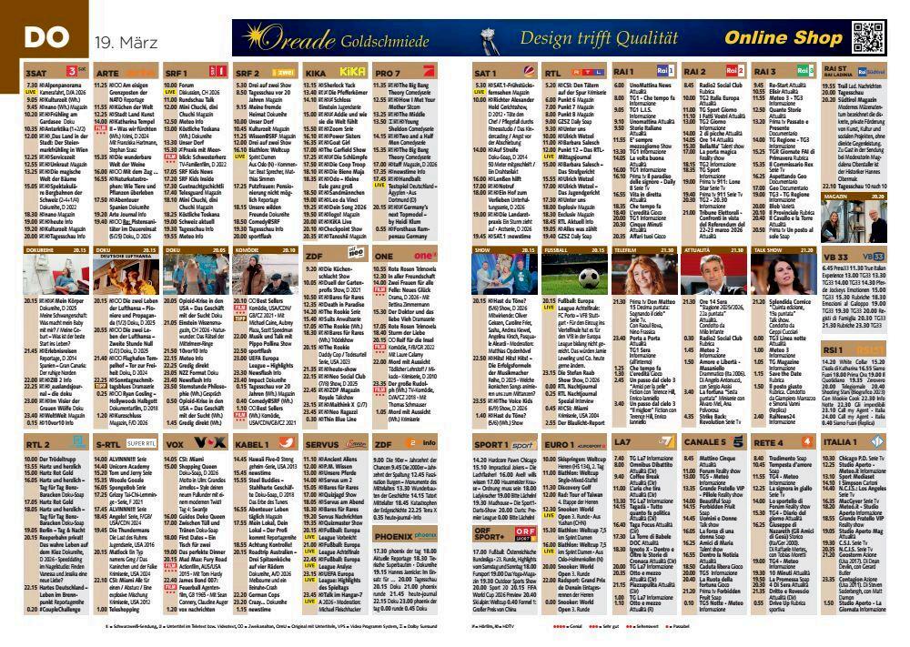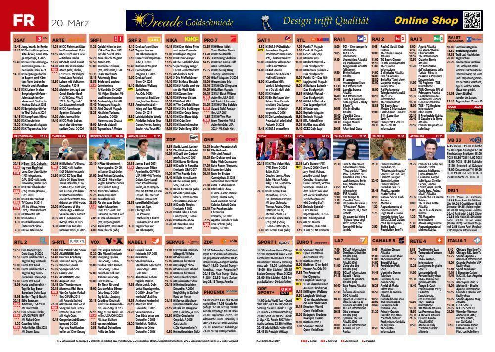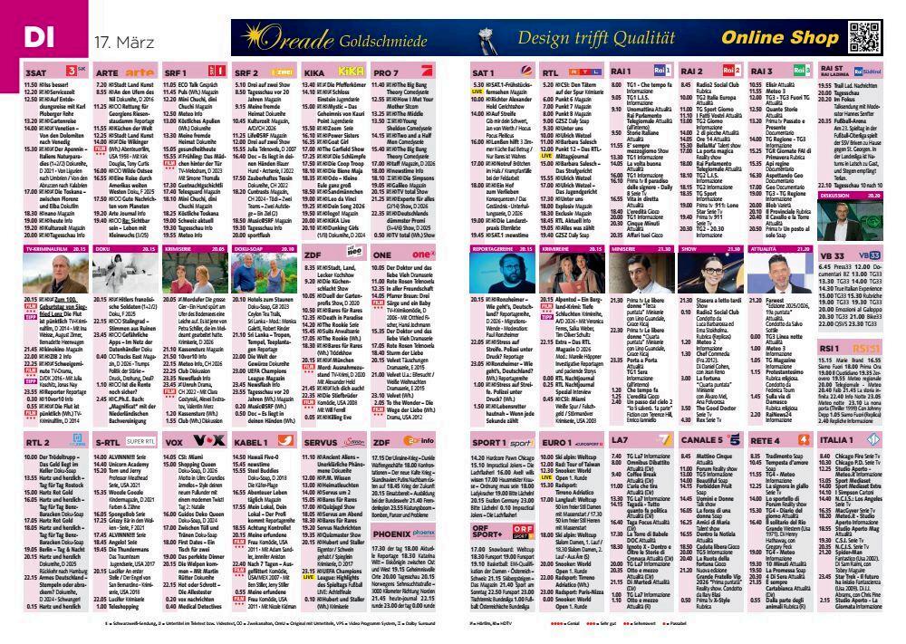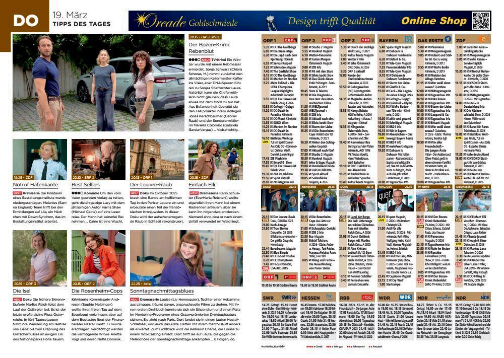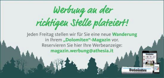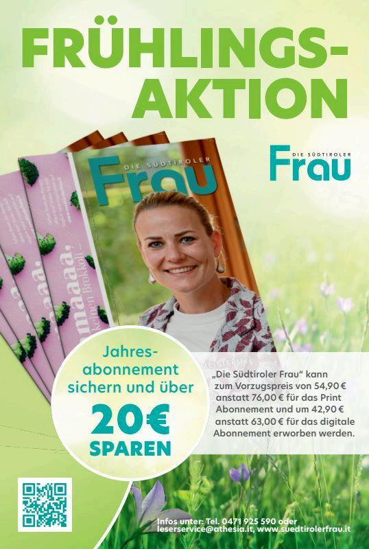 IMPRESSUM: EigentümerundHerausgeber:Athesia DruckGmbHBozen•Chefredakteur:ElmarPichlerRolle •RedaktionundKoordination:SieglindeHöller,Tel.0471/ 925732,sieglinde.hoeller@athesia.it•Redaktion:Martin Schmidt,ElisabethTurker•DeutschsprachigesFernsehprogramm:media-pressTV,Berlin•ItalienischsprachigesFernsehprogramm:MovingContentS.r.l.,Milano• Terminservice:JasminDorn,Annika Vikoler,39100Bozen,Weinbergweg7,Tel.0471/925465, dolomiten.magazin@athesia.it•Layout:ElisaWierer• Mediengestaltung:EmmaLutz,MonikaMiuzzo,Fabian Stuppner,dolomiten@athesia.it•Anzeigenkoordination:FrancescaDiFini,Tel.0471/925303,magazin.werbung@athesia.it•Anzeigenannahmeschluss:Freitag,14 TagevorErscheinen•Druck:GrafischeBetriebeAthesia DruckGmbH,Weinbergweg7,Bozen•FürdieRichtigkeitderTV-ProgrammehaftendiejeweiligenSendeanstalten.KurzfristigeZeitverschiebungenundProgrammänderungenliegenaußerhalbdesEinflussbereichesder Redaktion.•„Dolomiten“-Aboservice:Tel.0471/925590 •Privacy:AthesiaDruckGmbHhatgemäßArt.37der EU-Verordnung2016/679(GDPR)denDatenschutzbeauftragten(DataProtectionOfficer,DPO)ernannt.Die KontaktaufnahmefürjedesThemainBezugaufdieVerarbeitungderpersonenbezogenenDatenistüber dpo@athesia.itmöglich.