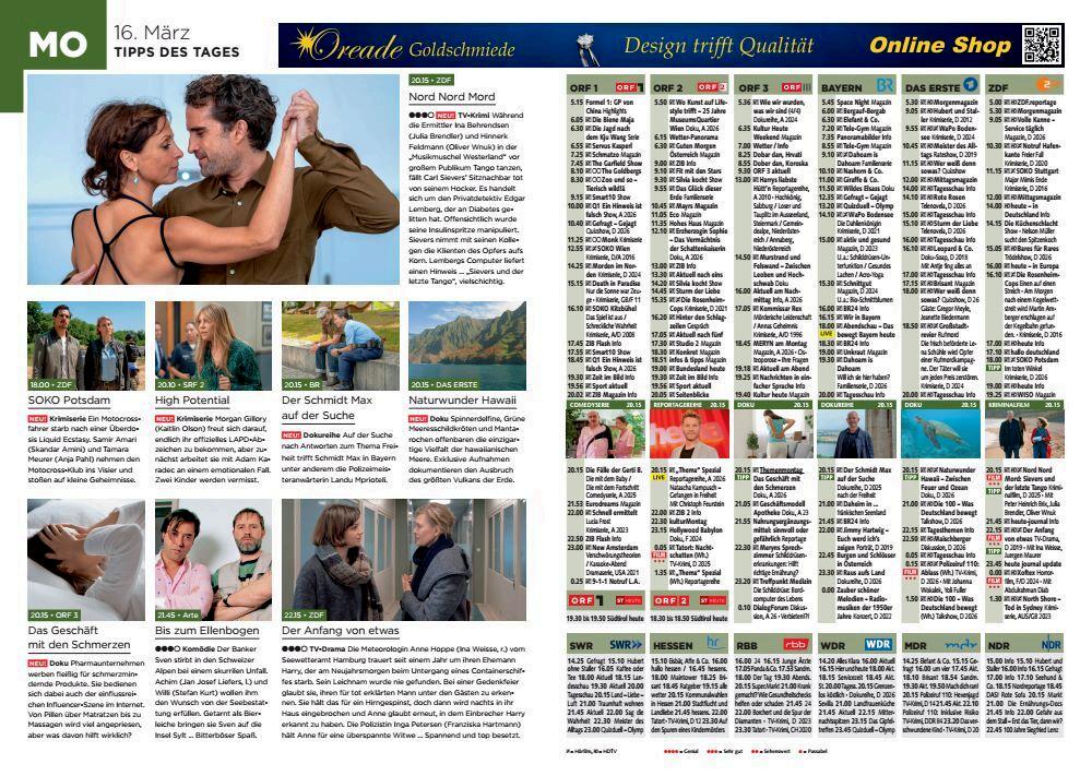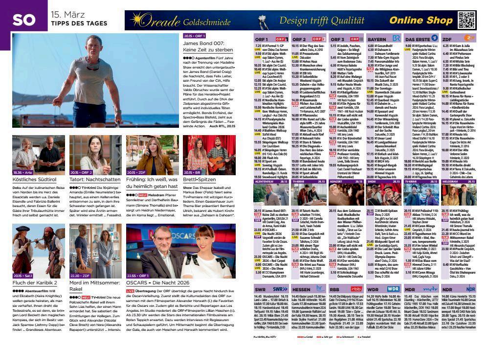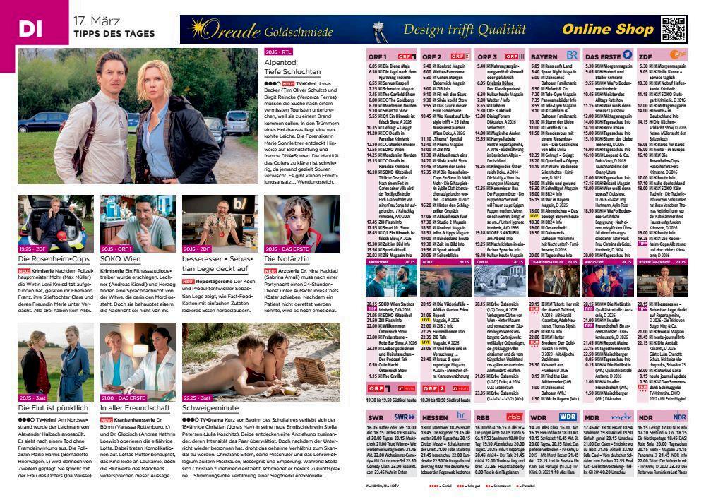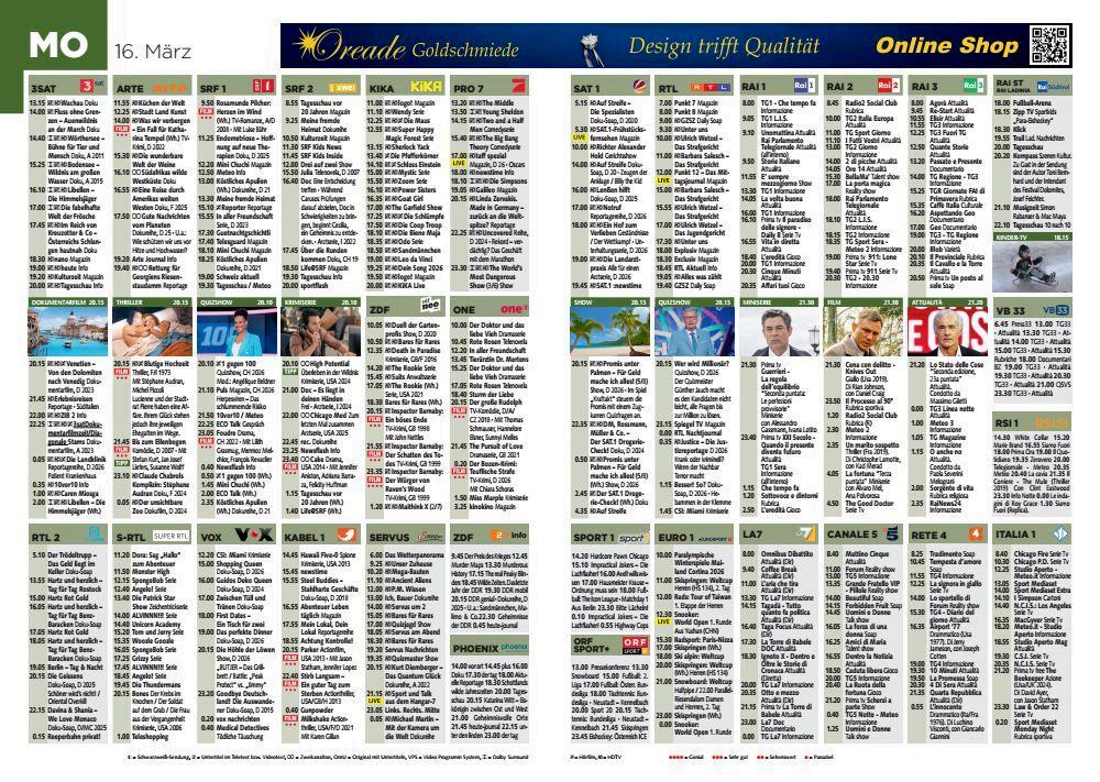 IMPRESSUM: EigentümerundHerausgeber:Athesia DruckGmbHBozen•Chefredakteur:ElmarPichlerRolle •RedaktionundKoordination:SieglindeHöller,Tel.0471/ 925732,sieglinde.hoeller@athesia.it•Redaktion:Martin Schmidt,ElisabethTurker•DeutschsprachigesFernsehprogramm:media-pressTV,Berlin•ItalienischsprachigesFernsehprogramm:MovingContentS.r.l.,Milano• Terminservice:JasminDorn,Annika Vikoler,39100Bozen,Weinbergweg7,Tel.0471/925465, dolomiten.magazin@athesia.it•Layout:ElisaWierer• Mediengestaltung:EmmaLutz,MonikaMiuzzo,Fabian Stuppner,dolomiten@athesia.it•Anzeigenkoordination:FrancescaDiFini,Tel.0471/925303,magazin.werbung@athesia.it•Anzeigenannahmeschluss:Freitag,14 TagevorErscheinen•Druck:GrafischeBetriebeAthesia DruckGmbH,Weinbergweg7,Bozen•FürdieRichtigkeitderTV-ProgrammehaftendiejeweiligenSendeanstalten.KurzfristigeZeitverschiebungenundProgrammänderungenliegenaußerhalbdesEinflussbereichesder Redaktion.•„Dolomiten“-Aboservice:Tel.0471/925590 •Privacy:AthesiaDruckGmbHhatgemäßArt.37der EU-Verordnung2016/679(GDPR)denDatenschutzbeauftragten(DataProtectionOfficer,DPO)ernannt.Die KontaktaufnahmefürjedesThemainBezugaufdieVerarbeitungderpersonenbezogenenDatenistüber dpo@athesia.itmöglich.