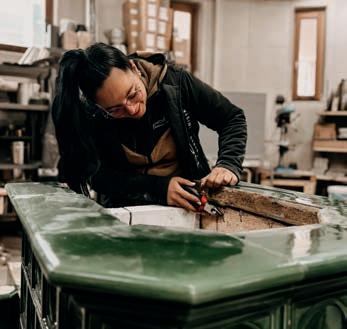 Jasmin beim Bau eines 170 Jahre alten Kachelofens, dessen Keramik zuerst sorgfältig in ihrer Werkstatt restauriert wurde