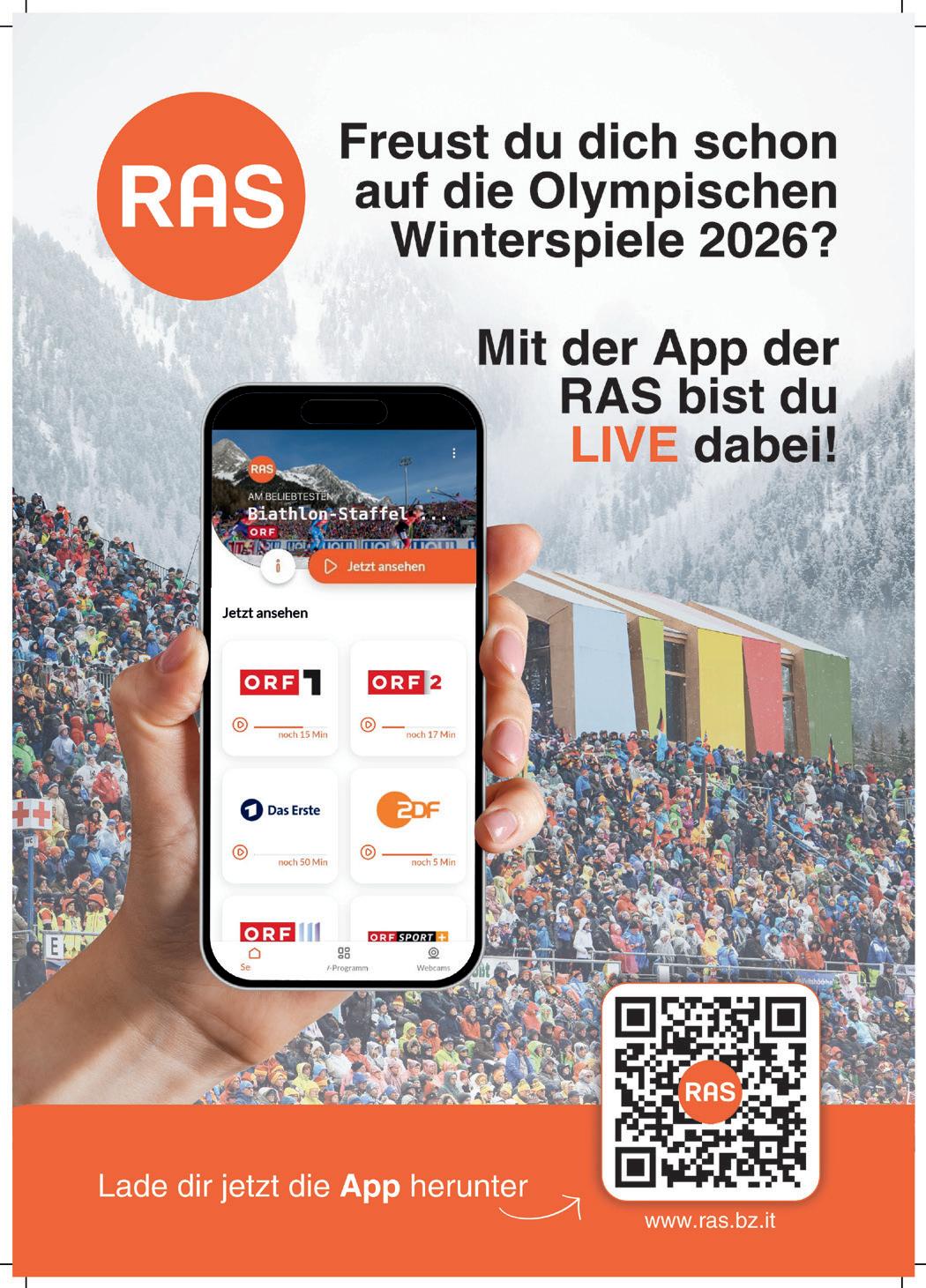 KIKA. „Ob Live-Übertragungen aus Antholz, aktuelle OlympiaNews oder spannende Hintergrundberichte – alles ist in Echtzeit abrufbar“, erklärt der Präsident der RAS, Peter Silbernagl. „Die App bringt die Olympischen Spiele direkt auf jedes Handy – für alle, die das besondere Olympia-Feeling auch unterwegs erleben möchten“, erklärt RAS-Direktor Georg Plattner. Der kostenlose Download ist im App Store und Google Play Store verfügbar.