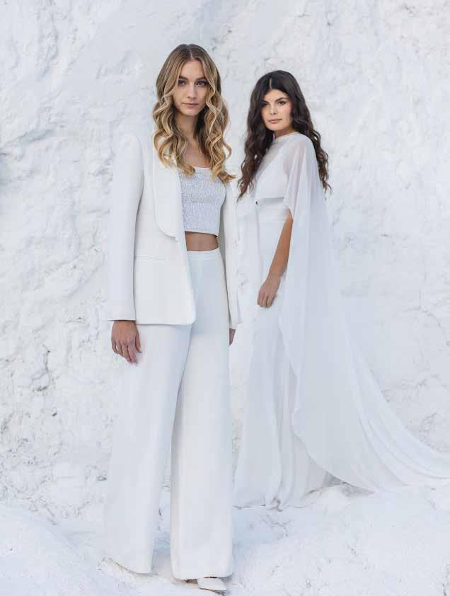 Brautkleider. Gut geschnittene Hosenanzüge locken mit Komfort, Bewegungsfreiheit und vielseitigen Designs, die die individuelle Persönlichkeit unterstreichen. Häufig gesehen sind körperbetonte Oberteile in Kombination mit weiten Beinen, die Leichtigkeit und Stärke versprechen. Zweiteiler bieten hingegen eine größere Flexibilität: Ob Crop-Top mit Tüllrock, Korsett mit Spitzenrock oder Bluse mit Palazzo-Hosen – je nach Geschmack, Location oder Jahreszeit kann die Garderobe locker, festlich oder verspielt sein. Mode mit Charakter ist in der diesjährigen Hochzeitssaison angesagt, weshalb kreative Zusammenstellungen überzeugen.