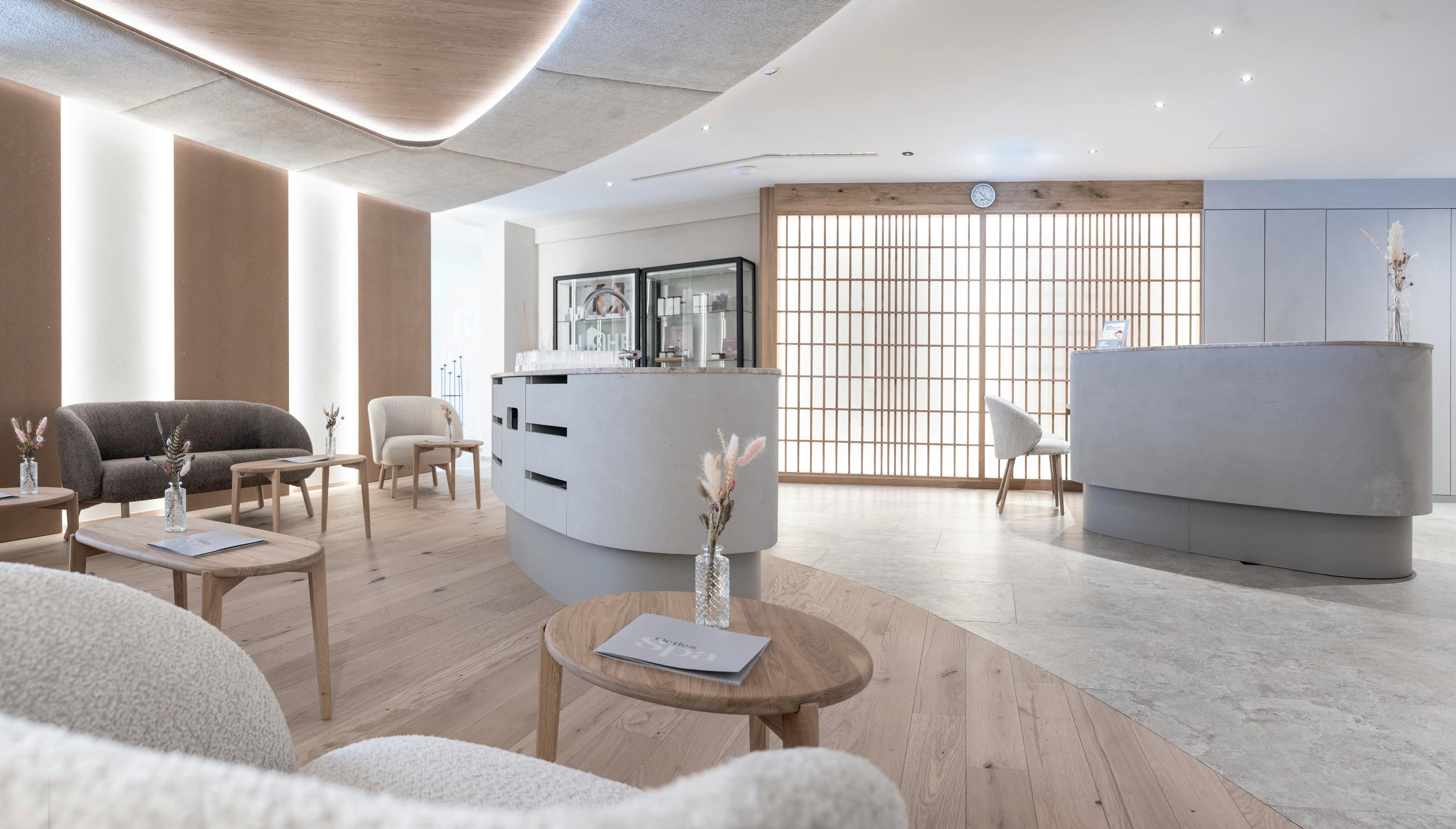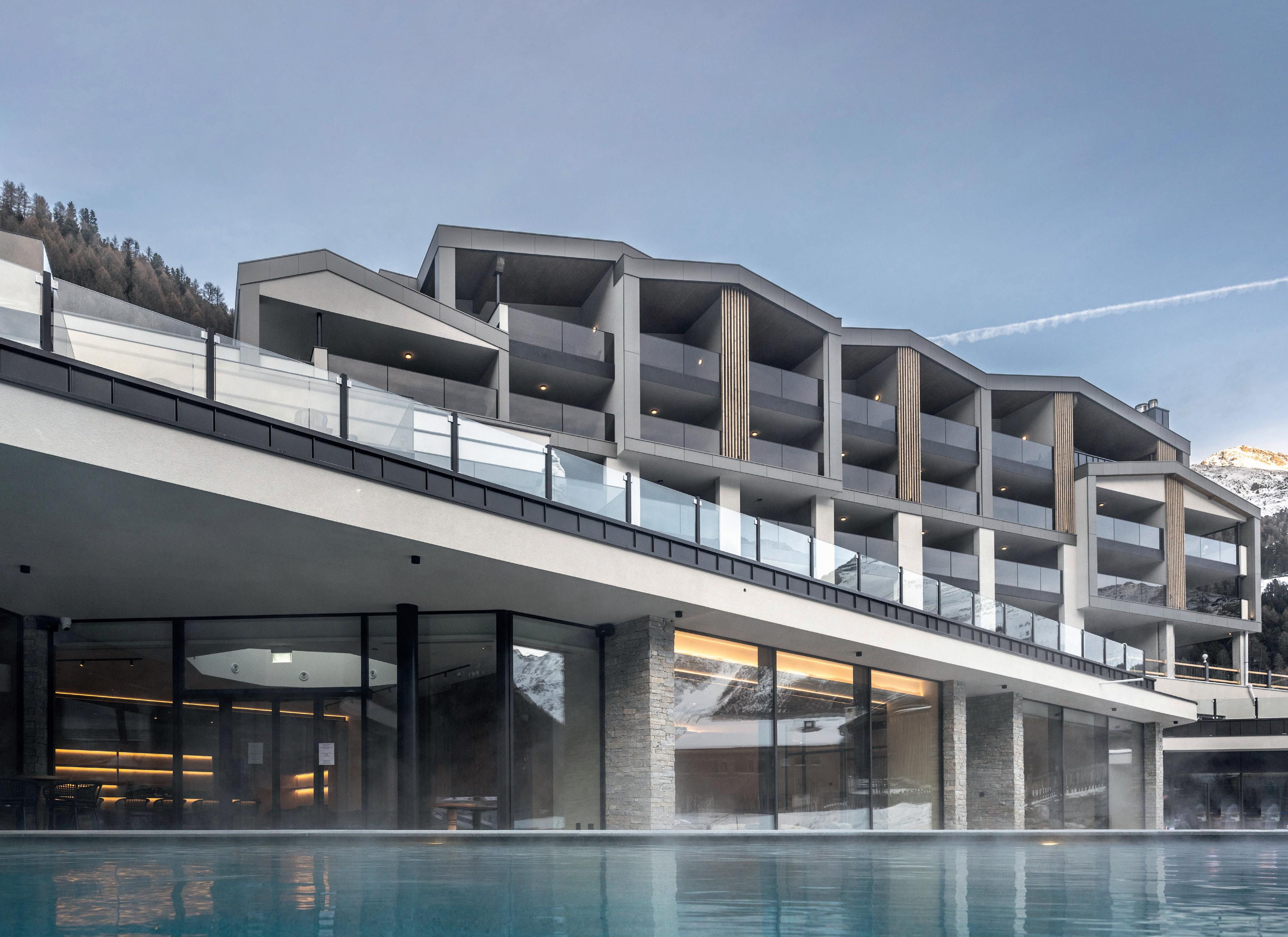 Große Fensterfronten holen die Natur ins Haus und machen die umliegende Bergwelt zum ständigen Begleiter. Architektur zwischen alpiner Klarheit und Moderne Besonderes Augenmerk galt der Funktionalität. Wege wurden verkürzt, Abläufe neu organisiert, Balkone verbreitert. Zwei neue Personenaufzüge und ein zentrales Treppenhaus sorgen heute für bessere Erschließung und Barrierefreiheit. Ziel war es, Form und Funktion in Einklang zu bringen – und den gewachsenen Bestand weiterzuentwickeln, ohne seine Identität zu verlieren.