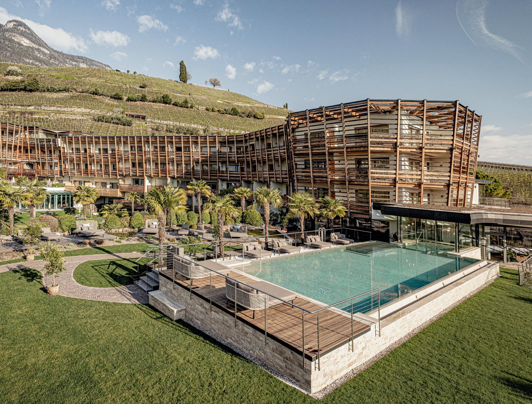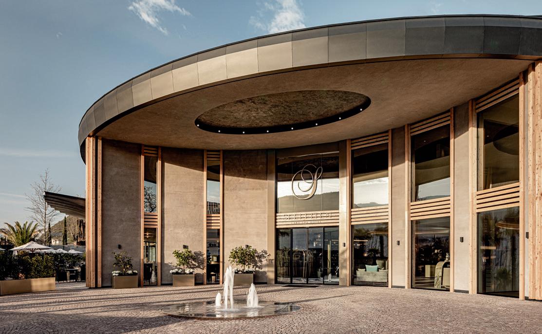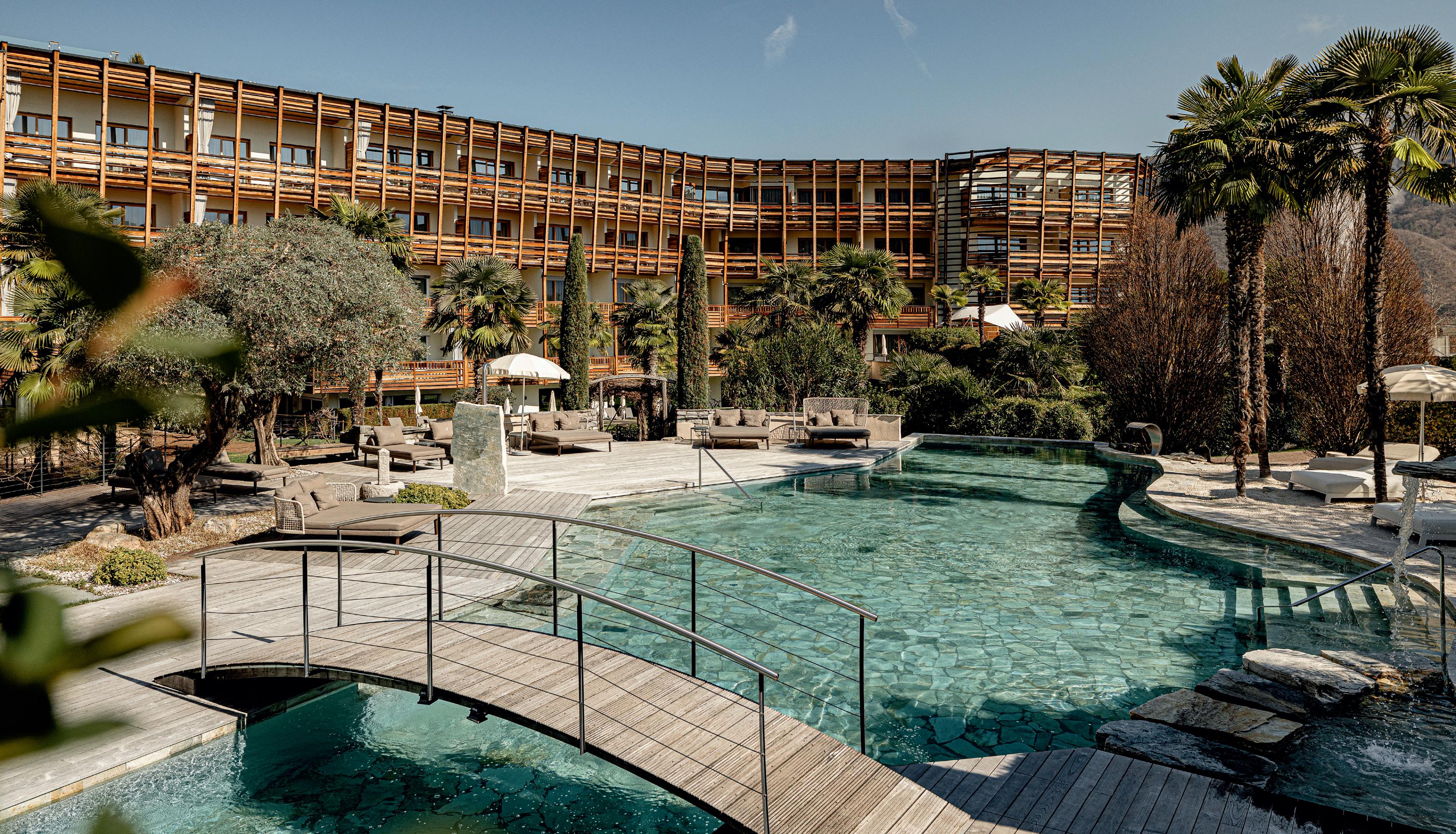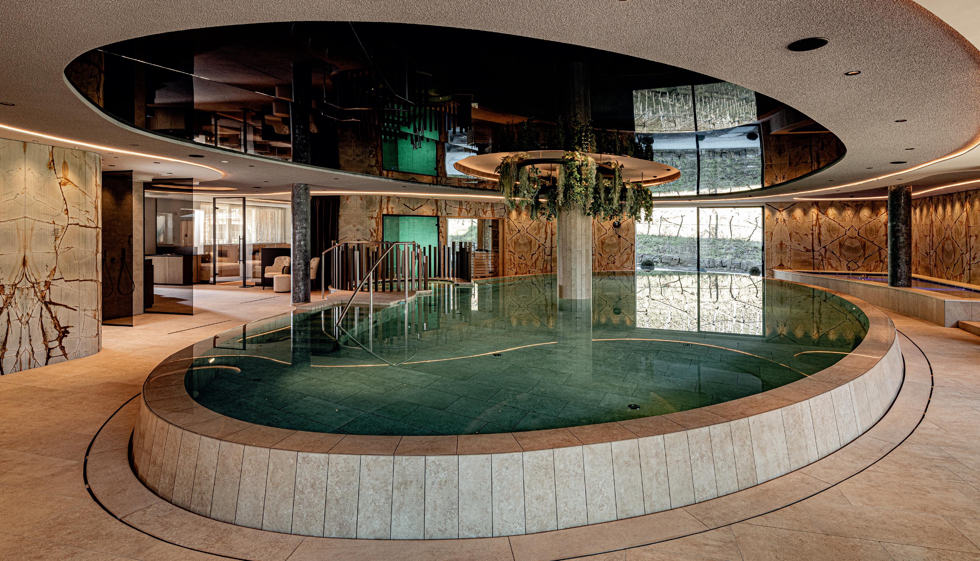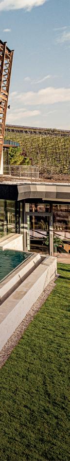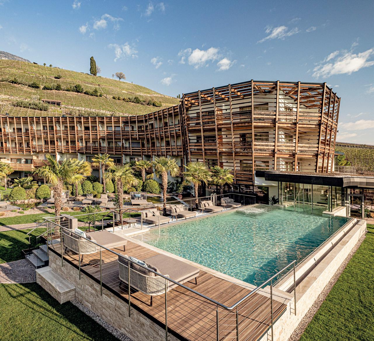 das Hotel umgibt – Reben, Palmen und der glitzernde Kalterer See. Räume für Ruhe und Weitblick Herzstück der jüngsten Erneuerung am Jahresanfang ist der Indoor-Pool-Bereich. Kein lautes Prunkstück, sondern eine stille Bühne: ein rundes Infinity-Becken, das wie ein Spiegel im Licht der Glasfassade liegt, geöffnet zum Palmengarten. Wer hier schwimmt, gleitet durchs Wasser in einen Zustand der Vollkommenheit.