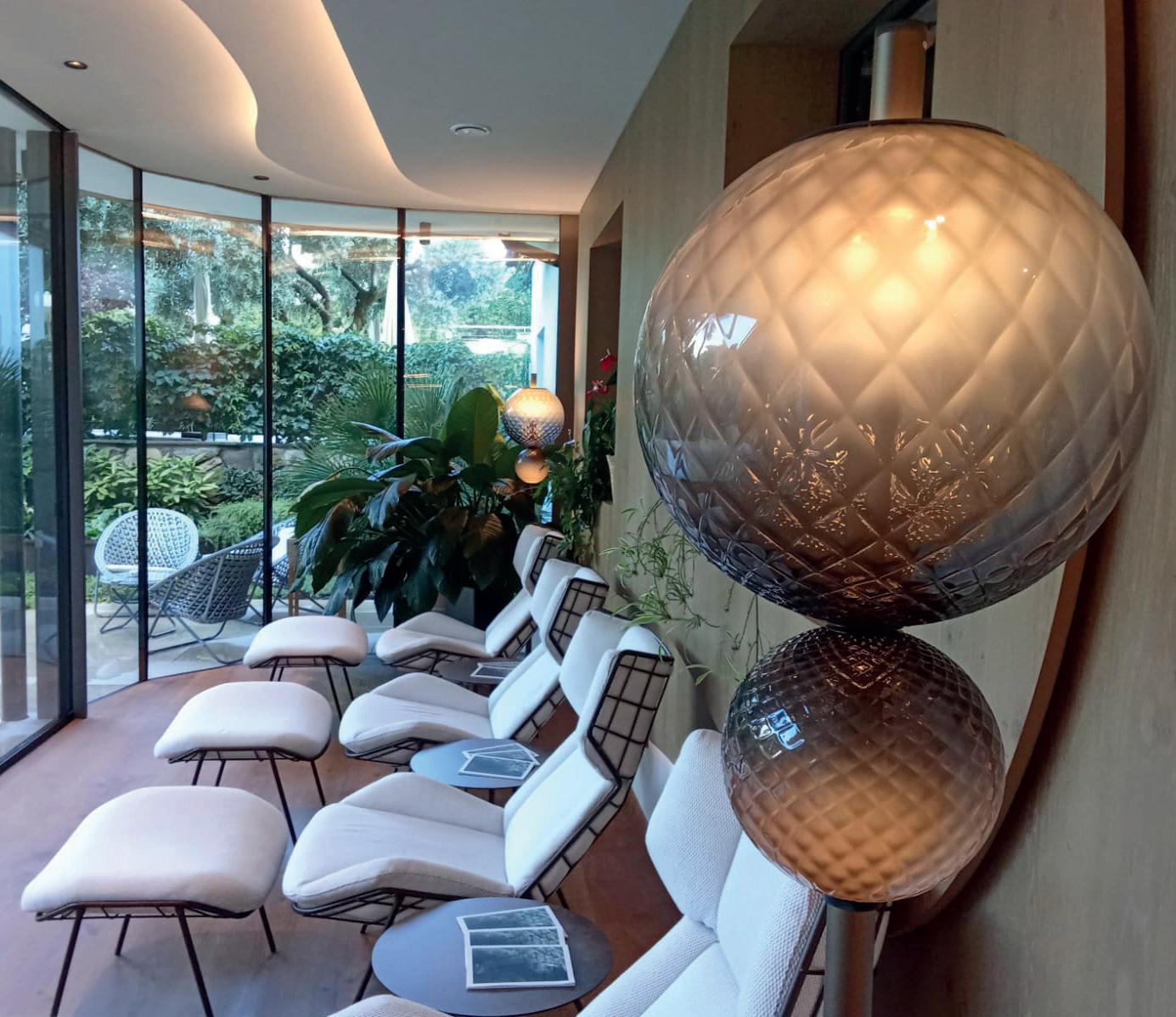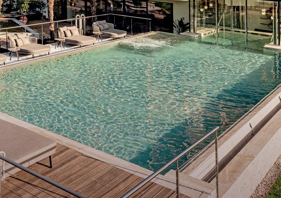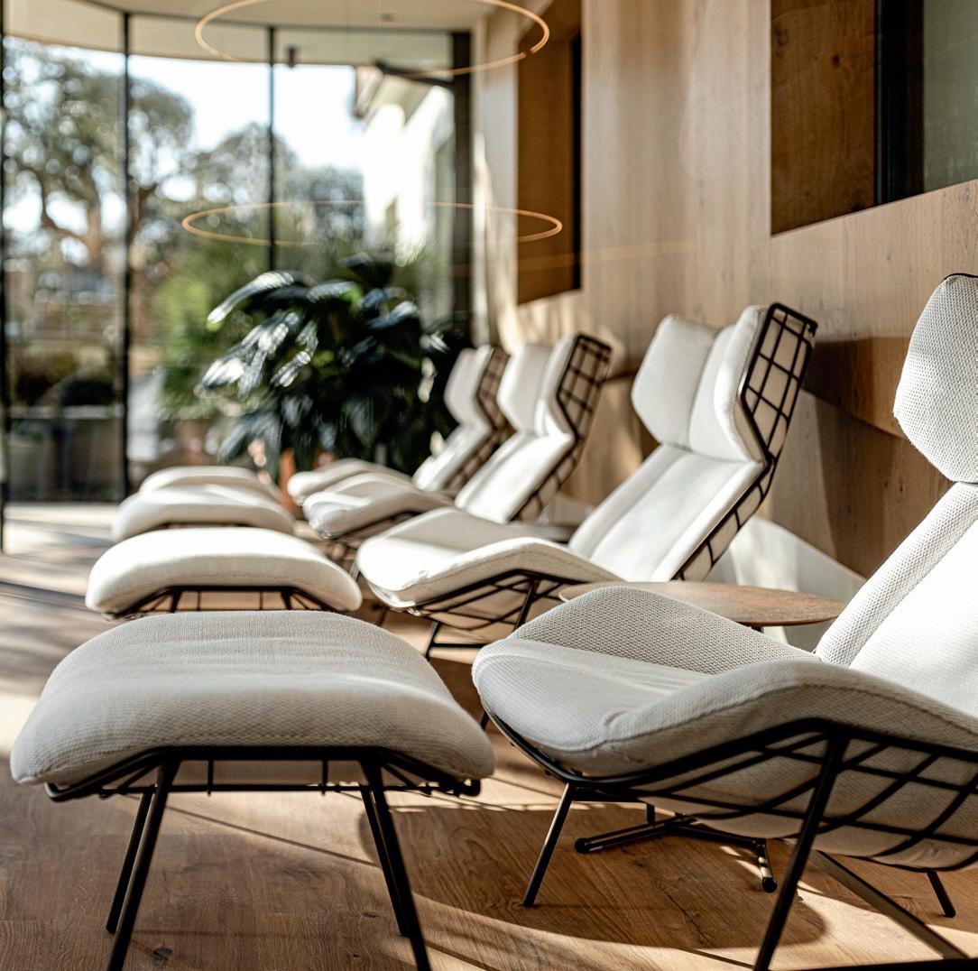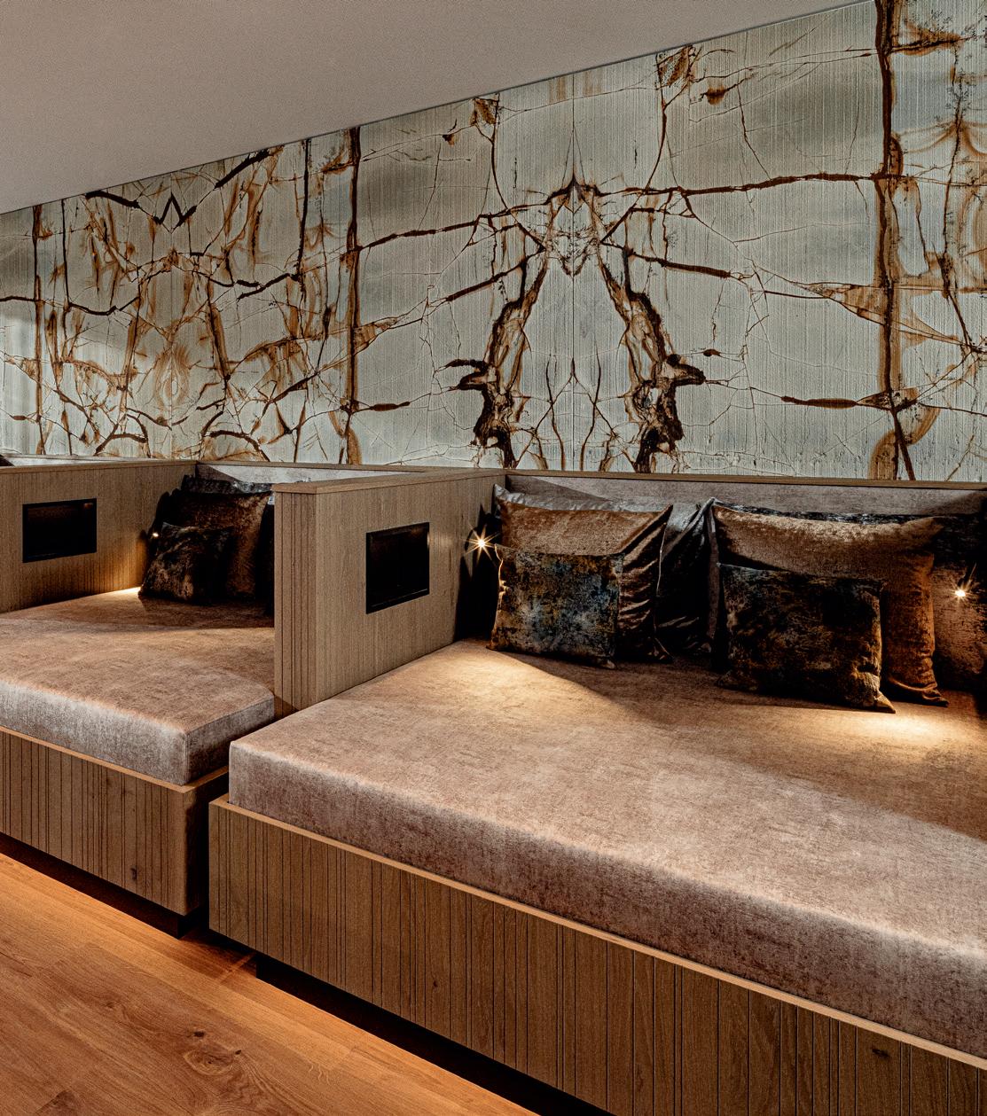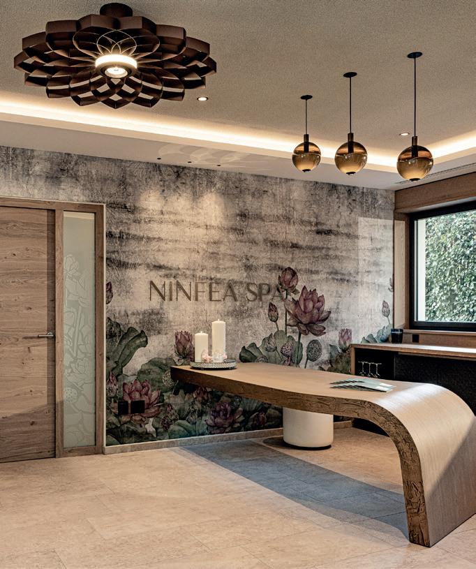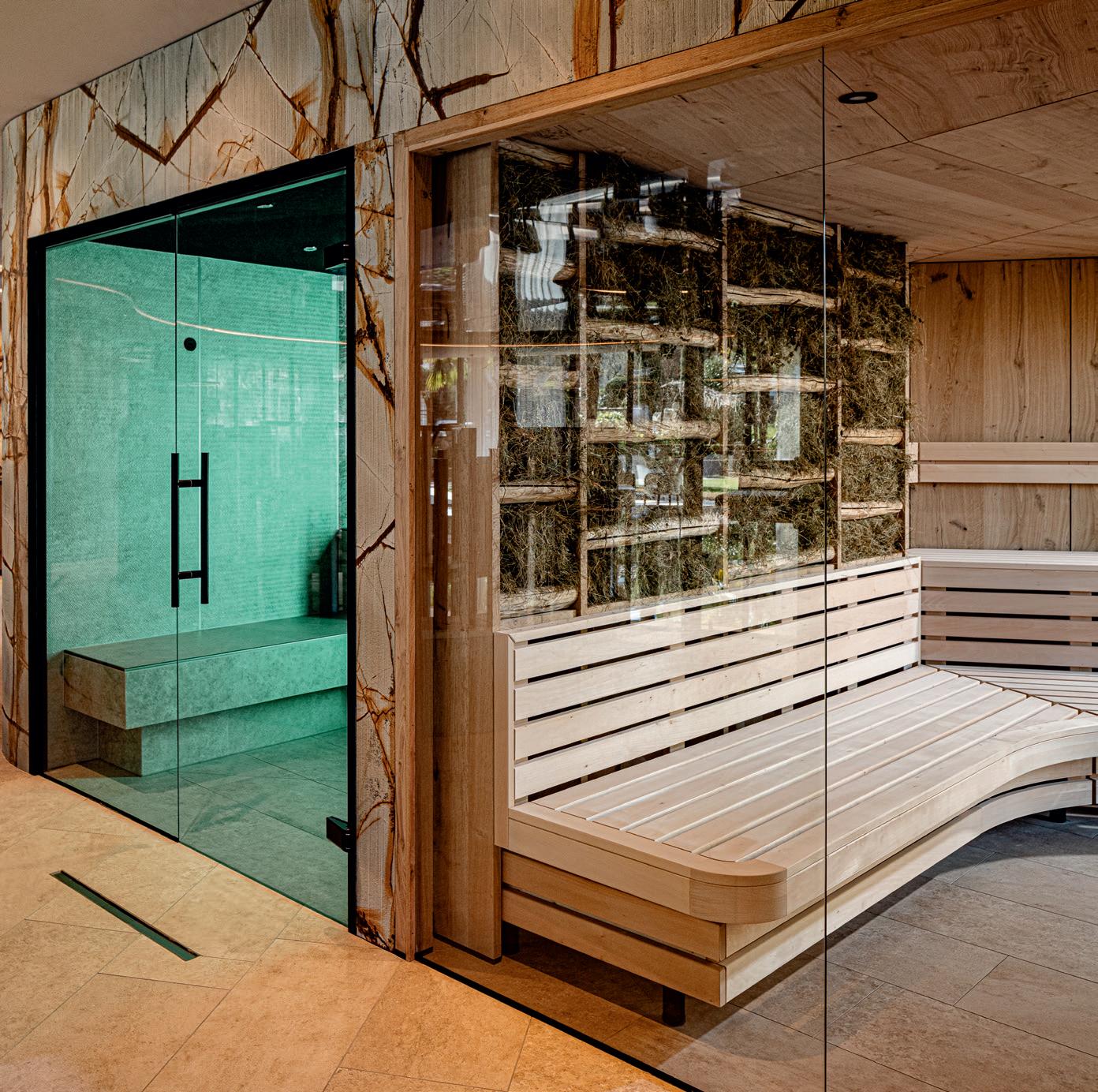 Zwei neue Saunen, Infrarotlie gen und Ruheräume ergänzen diesen Ort. Farben in Beige und Bronze, Materialien wie Marmor, Glas und Holz, und geschwungene Formen knüpfen eine leise Verbindung zur Landschaft. Der Spa setzt nicht auf spektakuläre Effekte, sondern auf schlichte Eleganz und organische Schönheit.