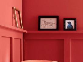 Selected for its charismatic color, Raspberry Blush’s showstopping red-orange bursts with boldness. From a cool and eclectic dining room to a lively living room with rich walls that contrast white wainscotting to a pop of color in your powder room or en suite, this rich coral is sure to make a statement in your space. Benjamin Moore suggests this crimson color ignites joie de vivre, or the exuberant enjoyment of life, spurring bold, beautiful, and upbeat expression. These qualities make it a hot fit for an arch, accent wall, or on trim or the ceiling. Raspberry Blush pairs well with neutral hues in the Color Trends 2023 palette, including Etiquette AF-50, White Heron OC-57, Gray Owl OC-52, and Onyx 2133-10.