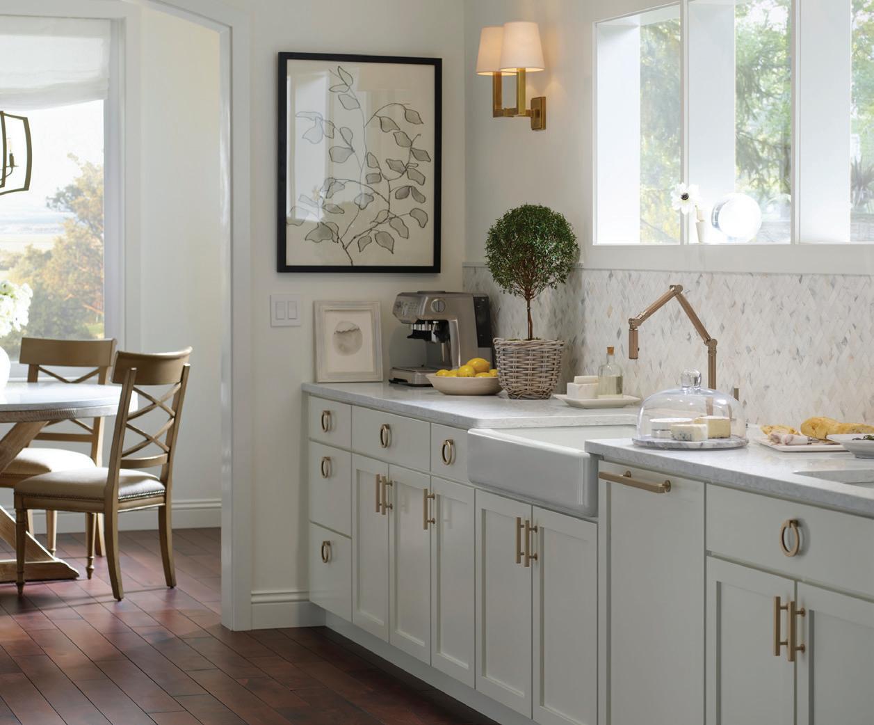 Nothing says timeless style and nostalgic appeal like the distressed glamour of old-timey brick. Have your cake and eat it too with an easy care smooth and durable installation void of rough texture and problematic pits and pores. A whitewashed finish highlights potted herbs, farm fresh produce and well-loved cookbooks while evoking the sense there’s a potager garden just outside the kitchen.
