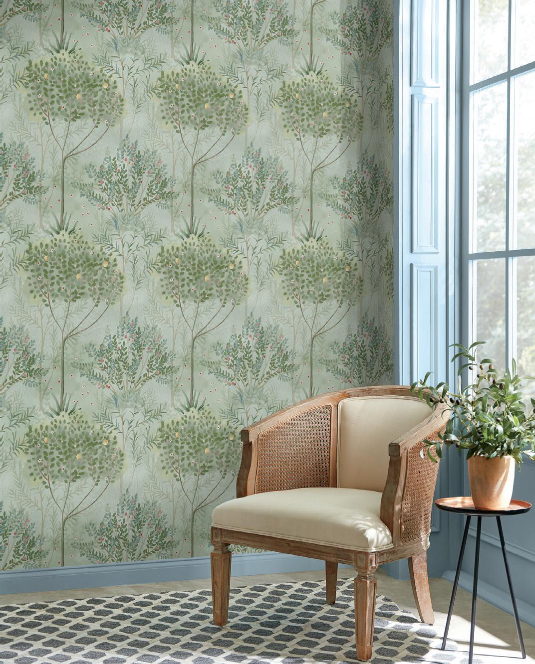 Lining the back of glass-front cabinets with York’s Wildwood Wallpaper RI5158 transforms everyday shelving into a living still life. Inspired by antique botanical illustrations, its expressive mix of wildflowers and greenery introduces depth and movement behind dishware while artfully framing small artworks and treasured objects. The layered pattern brings energy without visual clutter, allowing collections to feel vibrant yet composed. Used within cabinetry, Wildwood adds personality and color to a space often left plain, turning shelves into a decorative feature rather than simple storage.