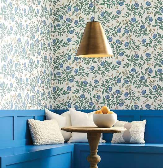 Design darling Rifle Paper Co. has done it again! Peonies and delicate buds in periwinkle and sage are tossed on a clean white background for a casual, optimistic feel. This modern take on traditional patterns with updated colorways, is particularly well suited to both midcentury designed spaces and the modern farmhouse look.