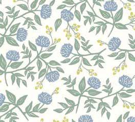 Design darling Rifle Paper Co. has done it again! Peonies and delicate buds in periwinkle and sage are tossed on a clean white background for a casual, optimistic feel. This modern take on traditional patterns with updated colorways, is particularly well suited to both midcentury designed spaces and the modern farmhouse look.