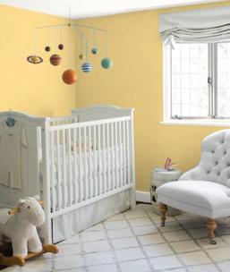 Try an all-over charcoal for depth, dimension and drama. Repeating the color on the feature wall, crib, chair and dresser maintains the serene and restful mood the color creates.