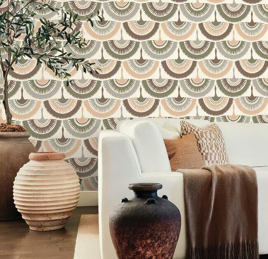 Melt into a timeless embrace with a nostalgic design narrative: the classic woven wool rug serves as a canvas for neutral furnishings, earthenware accessories, a melange of warm brown and beige textiles and the graceful arch of birds wings that create the fringed demilune fan shape of pattern Feather & Fringe. Together, the elements craft a cozy yet dynamic atmosphere that invites warmth and style into the space.