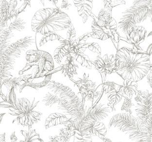 e simple and airy stylings of Tropical Sketch Toile are inked in thin lines of brown against white. Accents layered on the bed are punctuated by an earthy, dramatic green and anchored by the deep gray of the headboard and oatmeal linens. It's a perfect palette of personality and casual sophistication.
