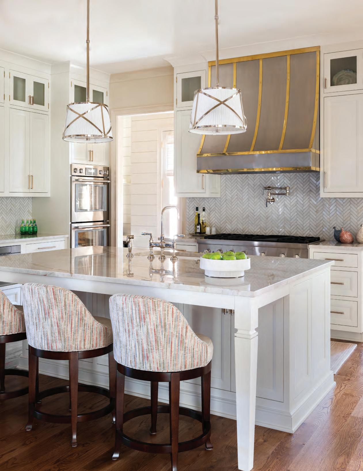 The stainless and brass vent hood is a showstopper, custom made for the home by Metalaire Louver. Its tones pick up the warm and cool accents of the Taj Mahal quartzite McCord used for the countertops on the base cabinets as well as the island.
