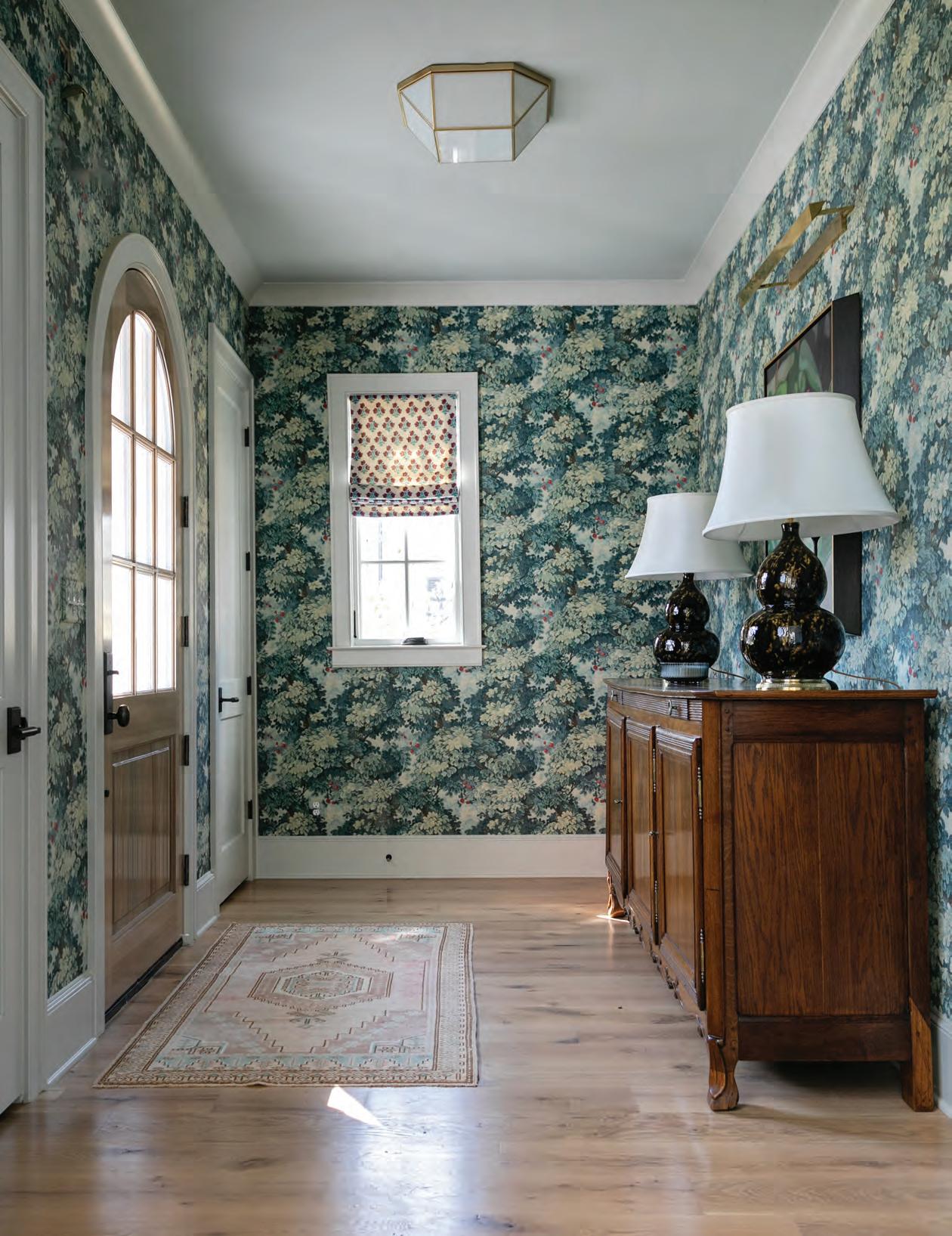 In the entryway she paired two complementary wallpapers, a classic large-scale pattern in neutral tones for the walls and a subdued, textured one by Phillip Jeffries for the ceiling. A French-style antiqued mirror from Garner Framing Co. enhances the sense of space and reflects the natural light that enters the welcoming area through the glasspaned front doors and transoms.