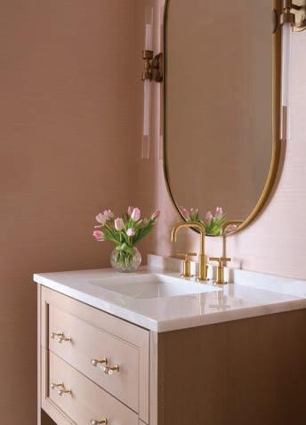 Meyers also applied her talents to two of the home’s bathrooms, giving one of the girls’ baths a spruce up and mounting a larger remodel in the primary bath. “Allison said, ‘We’re a house of girls. We’re not afraid of the bathroom being feminine.’ So we’ve really leaned into it,” says the designer. From the soft rose tones of the wallpaper and the Lauren Matsumoto collage painting to the marble arabesque floor tiles to the custom shower curtain, the space exudes subtle femininity.