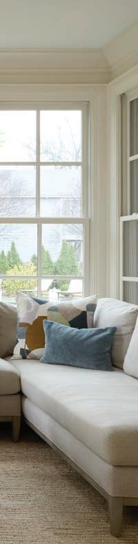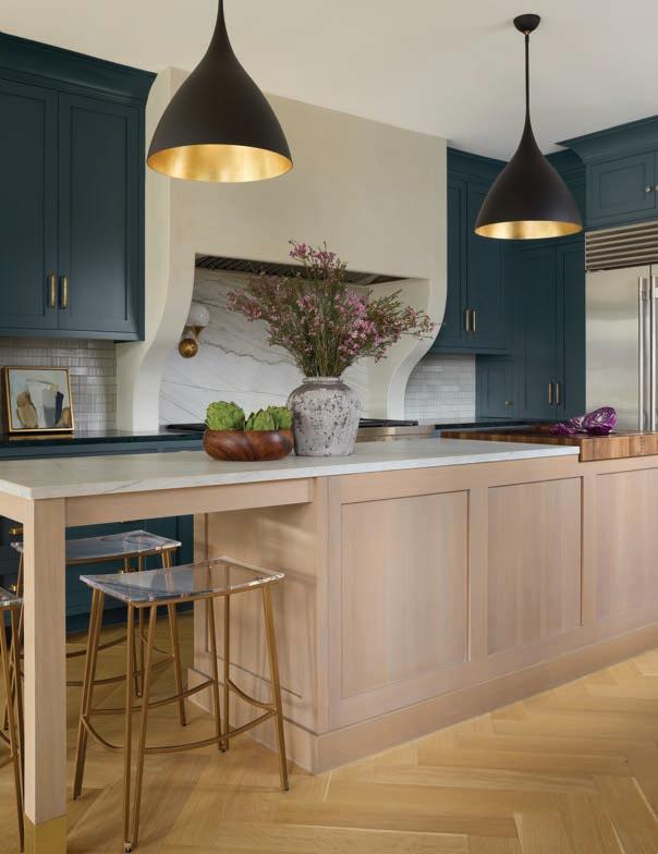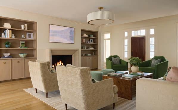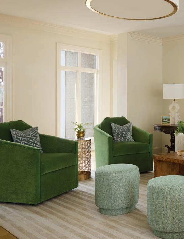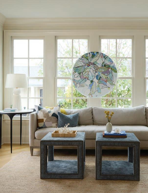 Thespace flows seamlessly into the keeping room, creating a trifecta of beautiful vignettes for entertaining or family time. Meyers kept the furnishings simple to take advantage of the spot’s wealth of light, provided by its three surrounding walls of windows. A low-back, contemporary sectional offers comfortable seating and conversation space without blocking views of the picturesque back yard and pool.