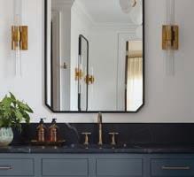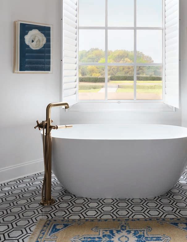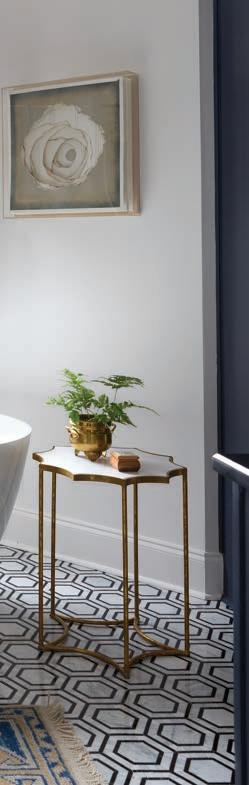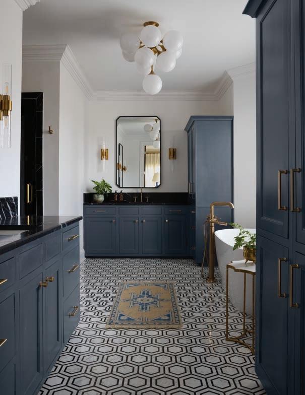 Bold and of-the-moment, the new primary bath blends dark, dramatic elements with clean white in perfect balance. The room’s original cabinetry found new life coated in Mysterious, a rich navy from Benjamin Moore, and dressed up with new brass hardware. Black Nero Marquina marble countertops take the handsome factor up a notch. Meyers repeated the stone on the shower walls, making the space a focal point. Hex tile floors in a scale a bit larger than the traditional add geometric interest—a bonus is that they are also heated. In place of the room’s original clawfoot tub now stands a sleek contemporary soaking tub with floormounted filler. While Allison loves the new tub, she’s happy its predecessor didn’t end up in the landfill. She says, “Now it’s in my second-grade classroom as a reading nook. The kids love it!”