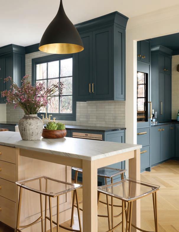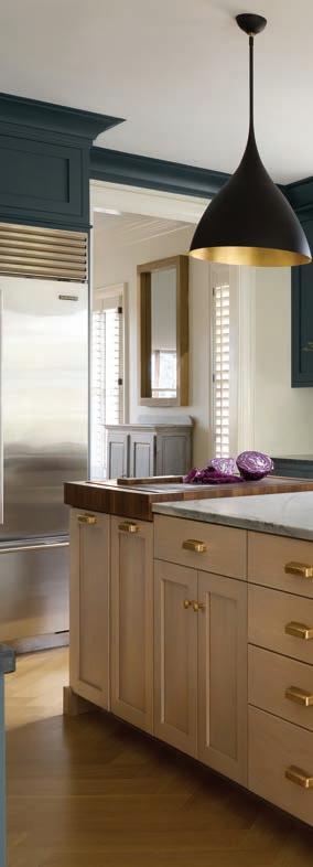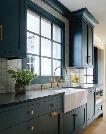 Thekitchen’s color palette is a study in contrasts; crisp white mingled with saturated blue/green, black and brass. Perimeter cabinets painted in Benjamin Moore