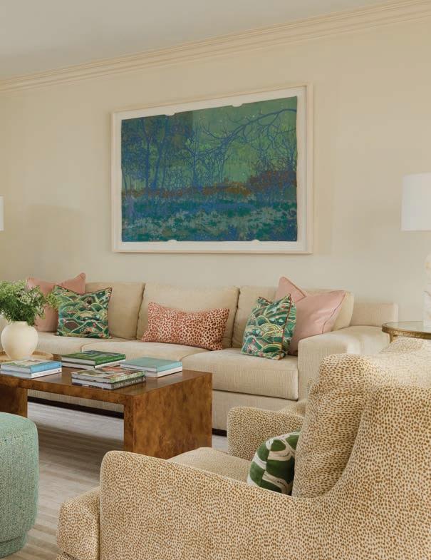 New furnishings complete the makeover. Meyers revamped the layout to a single conversation area with plenty of seating: a neutral sofa jazzed up with accent pillows in coral tones as well as Schumacher’s classic Rolling Hills pattern; a pair of green velvet swivel chairs that can turn to face the sofa or the TV; and twin club chairs with exposed legs in a warm finish that echoes the tones of the burl wood coffee table. In an artful juxtaposition of time periods and styles, Meyers placed a modern alabaster lamp atop an ornate pedestal side table that belonged to Buddy’s grandmother. An original gouache painting by Memphis artist Maysey Craddock completes the decor.