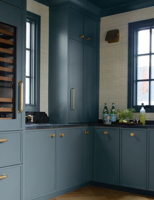 Only a single wall was demolished during the renovation, the one between the kitchen and the pantry. The newly opened area still holds plenty of storage, but also serves as additional space for entertaining. The Allens host family and friends often, so Meyers incorporated a dedicated bar area with a built-in wine cooler, refrigerator drawers, an ice machine and a sink. Here, she drenched all the cabinetry, trim and ceiling with the same dramatic paint color as the kitchen and lined the walls with a textured Phillip Jeffries wallpaper that was another early selection in the planning process. “Allison loved this paper, so it became a starting point for the aesthetic in here,” she explains.