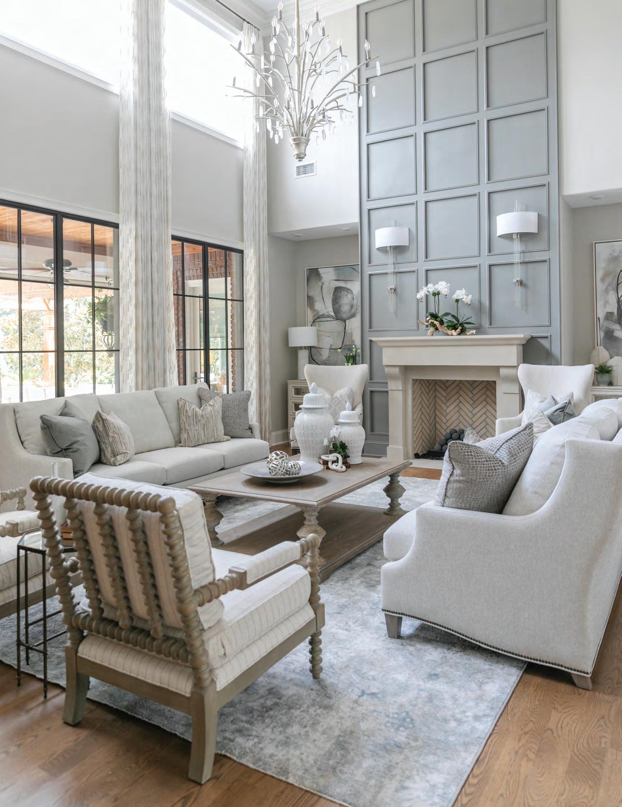 justas in the home’s main rooms, Loudenbeck also brought panache and drama into the smaller areas. In the downstairs hall bath she kept the monochromatic theme, but punched it up with a full-height mirror, extra lighting and marble surfaces. “It needed that glam feel because the other areas have such big personalities. We couldn’t do just a ‘normal’ renovation; we had to have a bit of sparkle here, as well,” she says. Even the more utilitarian areas near the rear entrance have special details—an accent wall of herringbone marble tiles paired with hand-painted grasscloth wallpaper in the half bath, and custom open shelves to display accessories in the laundry room.