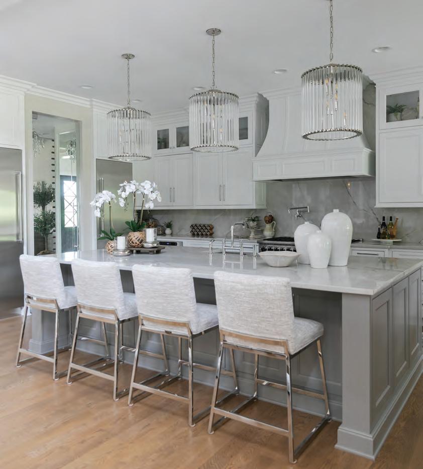 Oncethe owners decided to make the place they’ve called home since 2005 into their “new” dream home, they brought in interior designer Kim Loudenbeck, owner of Warehouse 67 in Germantown. First on the agenda was defining exactly the style to perfectly reflect the residents’ taste. After a process in which the homeowner and Loudenbeck explored a plethora of options, they zeroed in on a glamorous, monochromatic theme with plenty of sparkle. The look is inspired by the style prevalent in Las Vegas, where the couple own a second home.