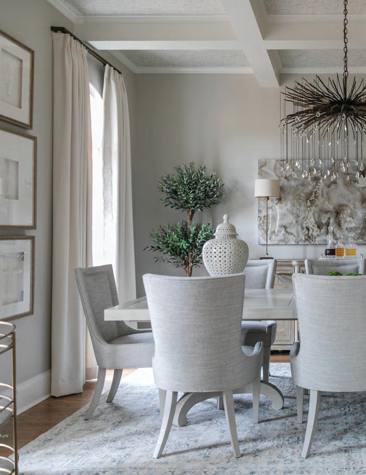 room. In the spaces between the beams of the newly coffered ceiling, she placed textured wallpaper. Its subtle metallic accents provide a bit of sparkle when the circular chandelier over the dining table is lit.
