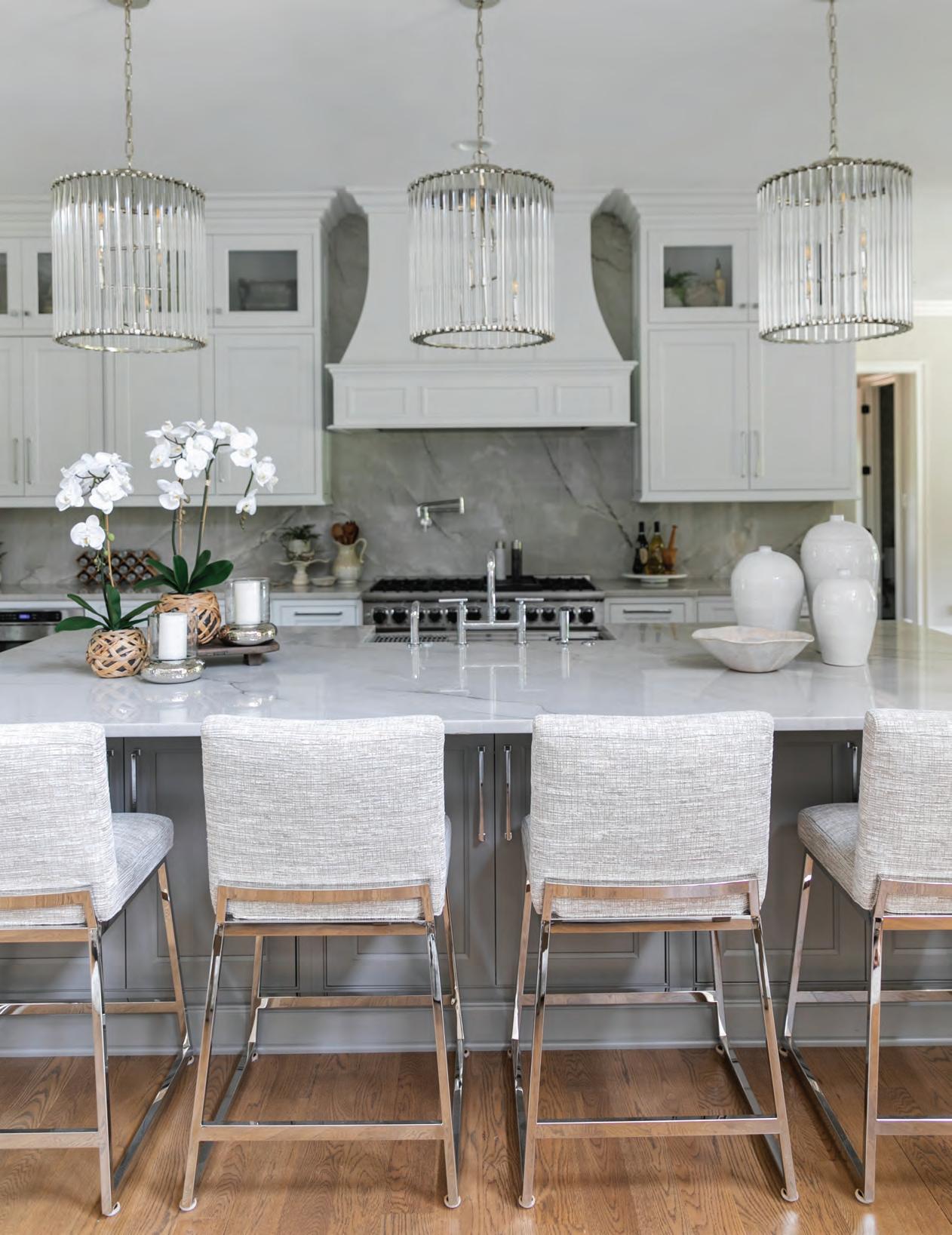 The homeowner knew she wanted her new kitchen to include as large an island as possible. She and Loudenbeck collaborated during construction to ensure the final product fits the scale of the now open design that marries the kitchen with the spacious family room. The ten-foot ceilings soar and a wall of windows floods the area with light. The renovation included fresh wainscoting bathed in a charcoal hue that creates a focal point around the new limestone hearth, the addition of full-length sheer curtain panels on the windows, and of course, more dazzling light fixtures.