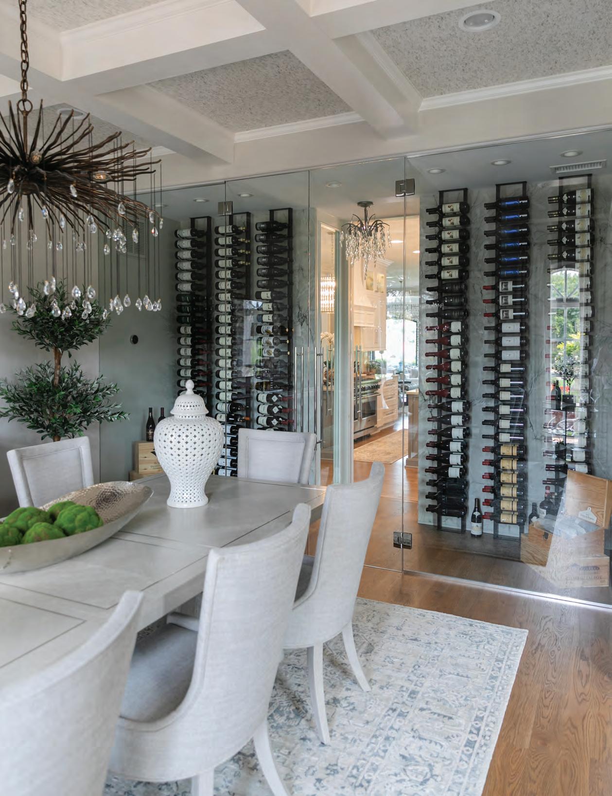 thestunning room is now a focal point with a solid granite wall treatment and floor-to ceiling wine racks. Its walk-through layout allows seamless flow between the dining room and the kitchen.