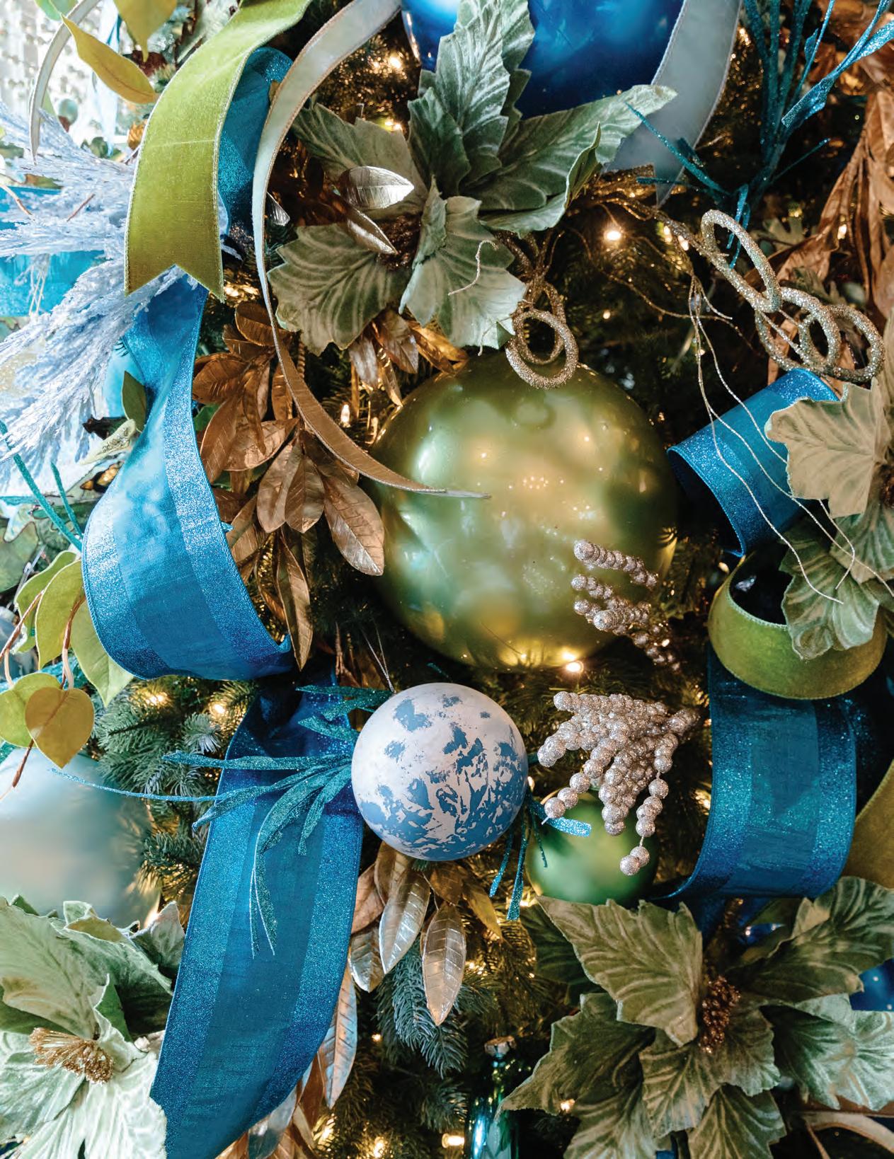thecenterpieces of Sharpe’s Christmas creation are twin trees that flank the limestone fireplace in the living room. Decorated in blues and greens, the trees reflect the palette that appears throughout the home. “Coming out of the pandemic, I was just ready for something whimsical that would make everyone who walked in happy,” says Garner. And Sharpe delivered in spades. The trees are decked out in luxe ribbon and dripping in jewel-toned ornaments including a few larger-than-life emerald-cut “jewels.” Brightly colored boughs that seem to mirror Garner’s excitement burst from the tops of the trees, adding an extra element of playfulness.