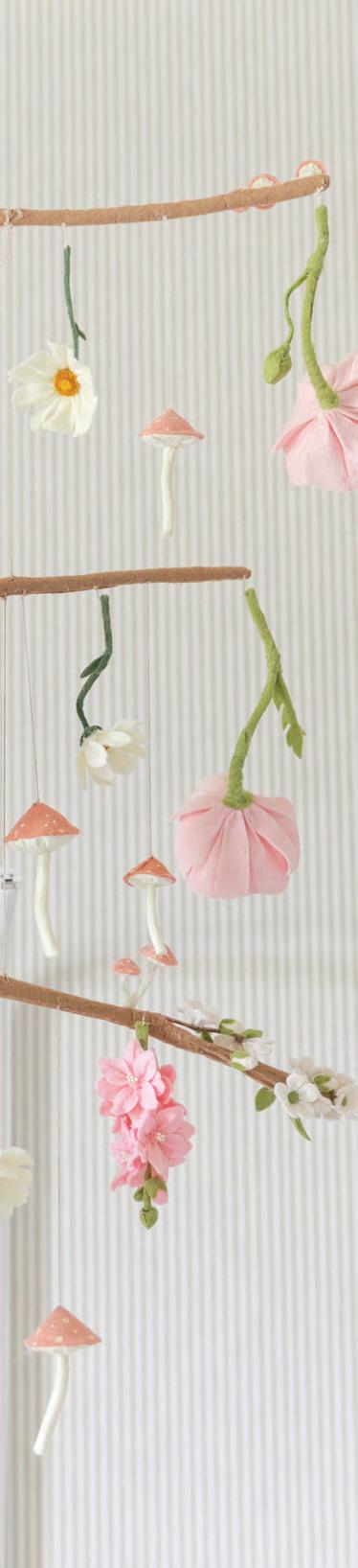 Themushroom motif that was prevalent in Hudson’s room design, a nod to one of Greenstein’s favorite foods and her popular blog “Caramelized,” makes a more subtle comeback in the whimsical crib mobile. Created by Grenada, MS, artist Maggie Harrison, the custom piece features woodland blossoms in pink, rose and white felt, as well as the most adorable fungi that look like they jumped off the pages of a storybook. Also crafted by Harrison, a pair of giant-scale paper flowers keeps a wicker mushroom basket company in one corner.