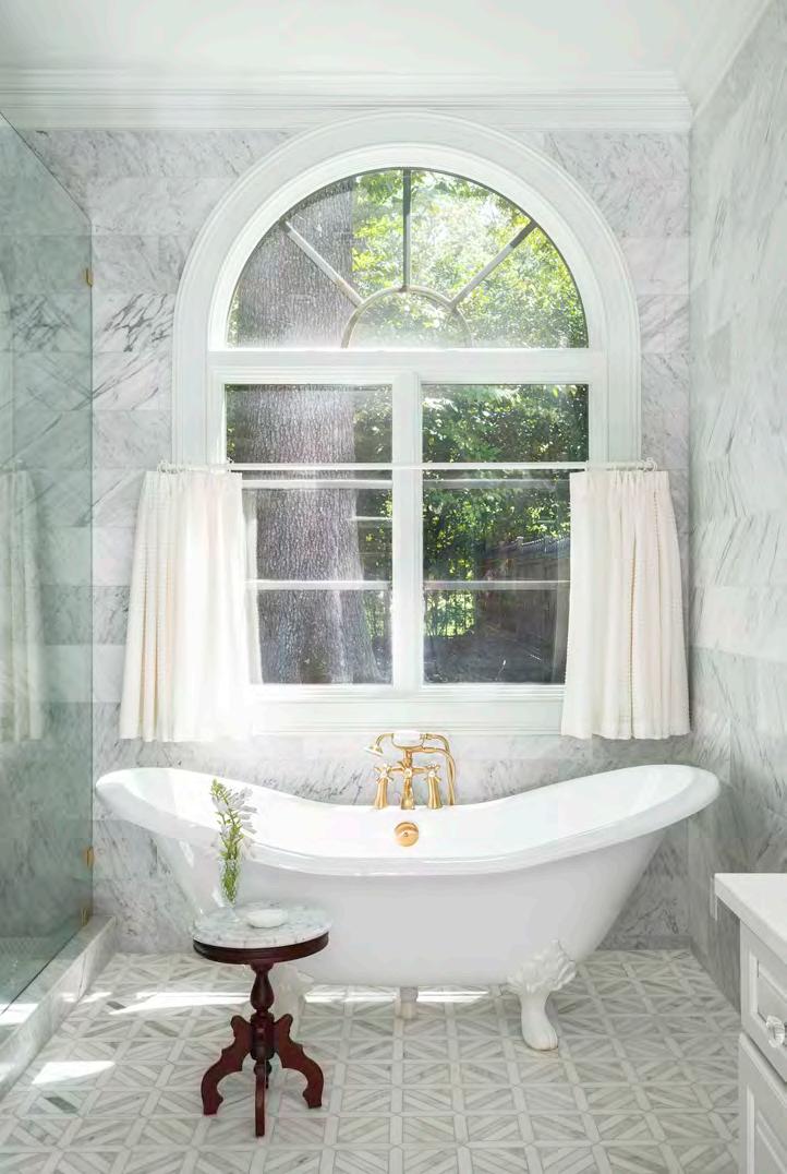marble mosaic floors set the stage. A stylized clawfoot tub sits beneath a graceful arched window that was formerly covered with shutters. One of Clarke’s favorite hacks for a bathroom window, a lined cafe curtain, now allows light in and affords privacy when needed. Indulging Rachel’s love for all things pink, Anna French floral wallpaper in pinkish lavender and coral brightens the space.