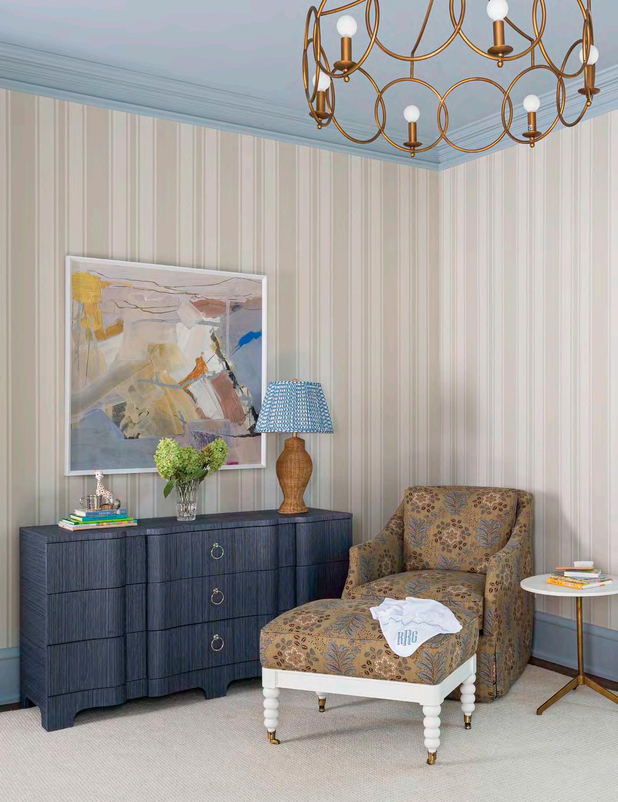 Thenursery is another spot where timehonored elements coexist with fresh twists. Clarke helped Reedy prepare for her first child, a boy, starting with a handsome striped wallpaper from Schumacher. Farrow and Ball Parma Gray, a subtle blue/gray hue, on the trim is ideal for a young gentleman. Above the antique-style metal crib hangs a set of vintage hot-air balloon prints tinted by hand to reflect the room’s color palette. The whimsical mood continues via a Gabby chandelier overhead that brings the look of a circus tent to mind. The room stays true to Maggie Clarke style, however: modern stands juxtaposed with nostalgic. An eclectic corner vignette includes a navy lacquered grasscloth dresser, a skirted chair and