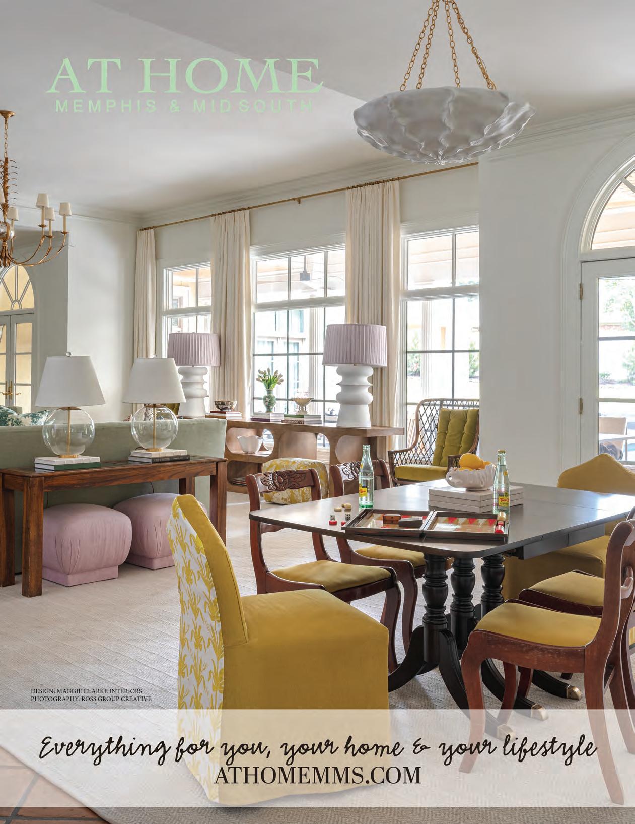 Call 901.684.4155 or subscribe at athomemms. com . Annual subscription rate: $19.95. Single copy price: $4.99. At Home Memphis & Mid South is published 12 times a year. Postmaster: Send address changes to At Home Memphis & Mid South , 7776 Farmington Blvd, #1321 Germantown TN 38183 . We make every effort to correct factual mistakes or omissions in a timely and candid manner. Information can be forwarded to Trip Monger; At Home Memphis & Mid South , 7776 Farmington Blvd, #1321 Germantown TN 38183 or to tmonger@athomemms.com.