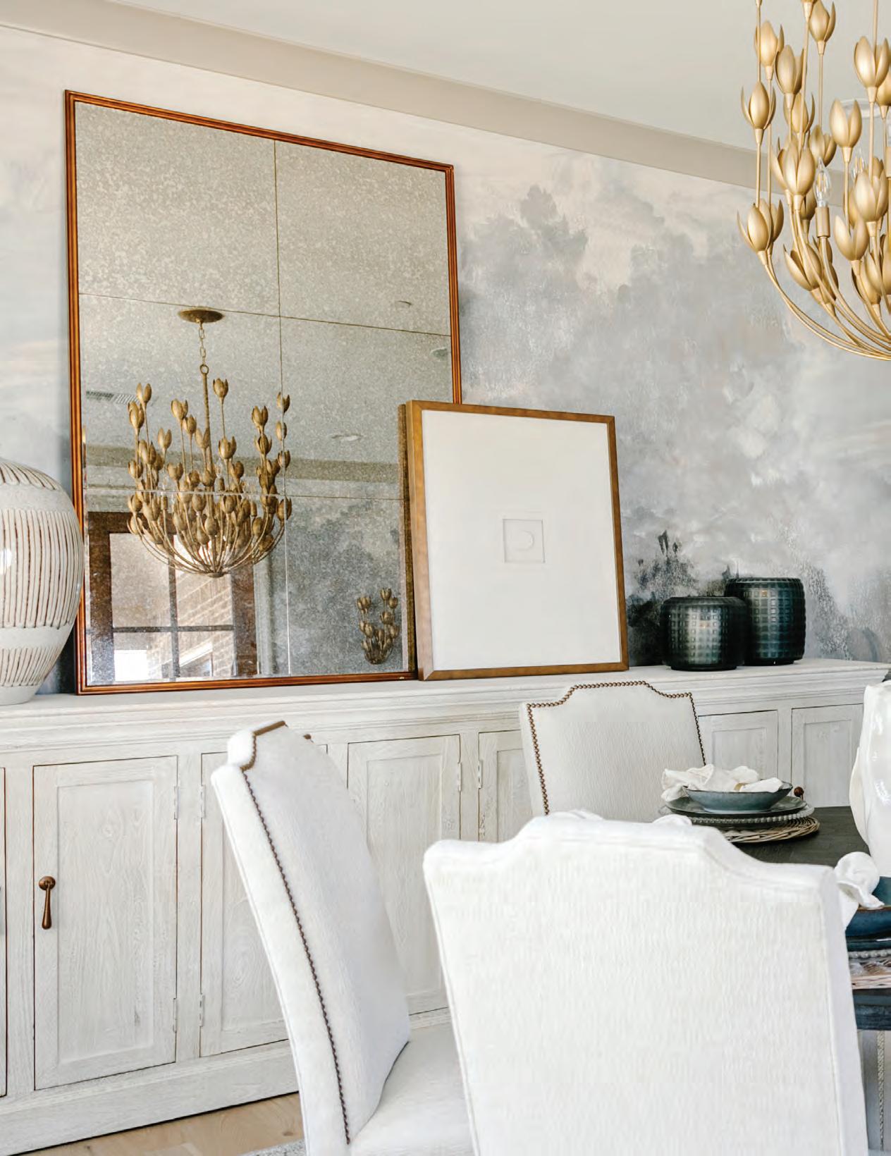 "Fromday one, I knew we had to make the dining room a focal point,” says Loudenbeck. “Because it is tucked away, if we didn’t do something a little bit bolder, it might just fall by the wayside.” That bold treatment came in the form of moody, mural wallpaper and unique light fixtures. The room has more than just good looks, however. Functionality is the name of the game here. The area is versatile enough to be used as a more formal dining room or a casual spot for breakfast. And, because it can be closed off by rolling doors, it could easily serve as a home office if the eventual owners desire.