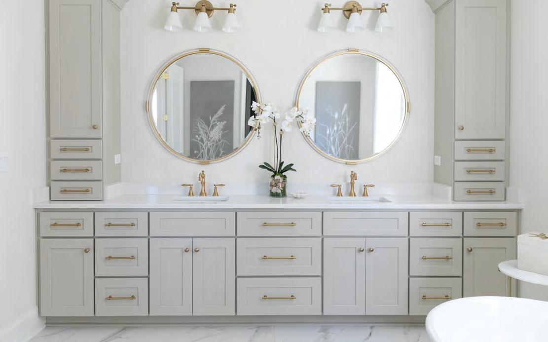 “Who wouldn’t want to have a bathroom like this?” asks the designer, entering the primary bath. “I didn’t want this house to give up any of the elements that make a larger home appealing. I love the oversized tiles that are trending right now. Here we chose twoby-four-foot floor tiles and I think that adds so much drama. Typically you only see those in commercial spaces. Bringing them into the home gives you less grout and larger scale of pattern.”