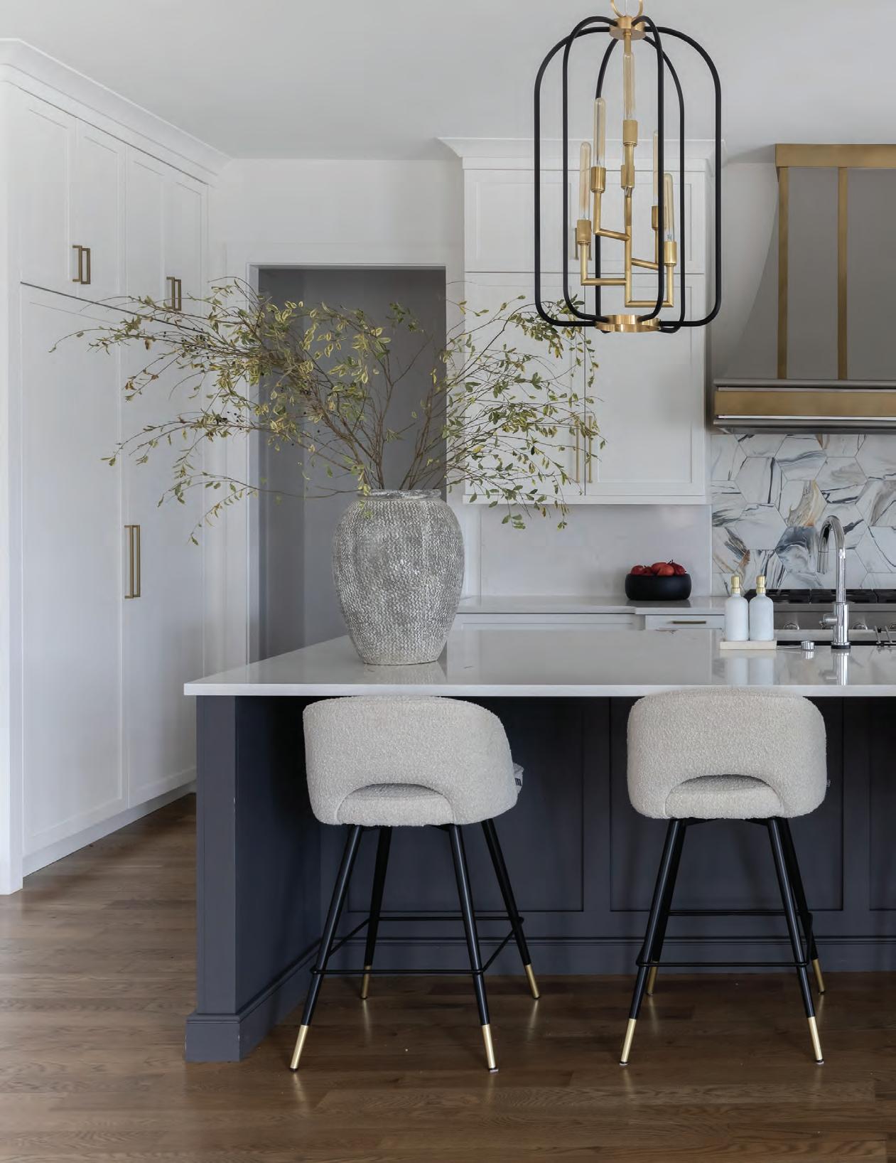twin brass and black light fixtures above the adjacent kitchen island add an element of drama. Lovelace explains, “They wanted something statement making, so we went with the oversized lighting. It makes a big impact in the room.”