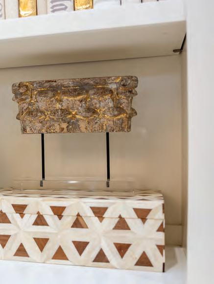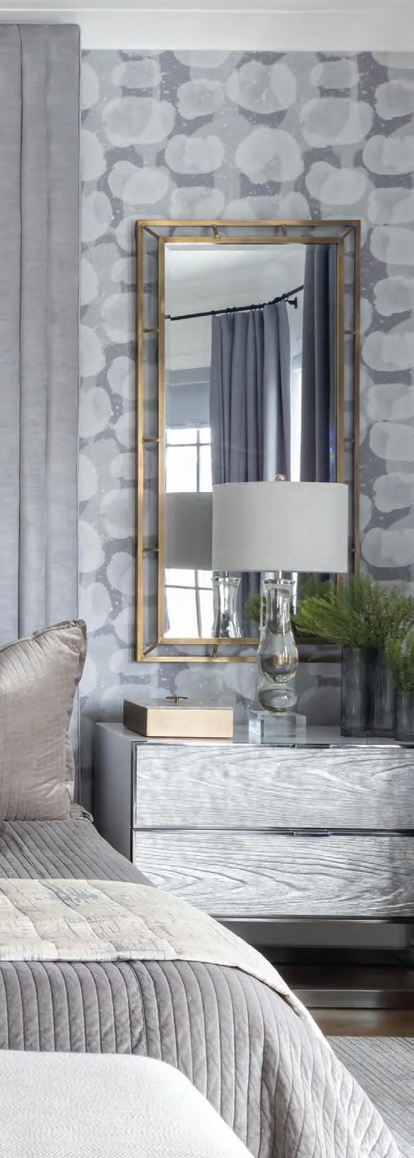 If the bedroom shouts luxury, the primary bath whispers it with a bright, airy feel. White vessel sinks, countertops and cabinets accented with chrome hardware create a clean, fresh look. Lovelace seamlessly worked in two outof-the-ordinary features her clients designated as must haves: a refrigerator drawer for the skincare products Bagchi likes to keep chilled, and a smart mirror that can display the time, weather conditions and more when enabled. Lovelace’s design cleverly embedded that device in the large bank of mirrors that spans the entire wall so that it blends in perfectly when not in use.