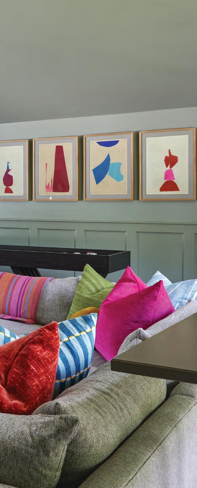At first, the design team was asked to simply paint it; but the concept started to evolve, and the homeowners love the finished product. Serene, sage-tone walls are complemented by black-and-white curtains and pinstriped ottomans. Pops of color abound in a fun crowd of throw pillows, coordinating with the colorful artwork series behind the shuffleboard and foosball tables.