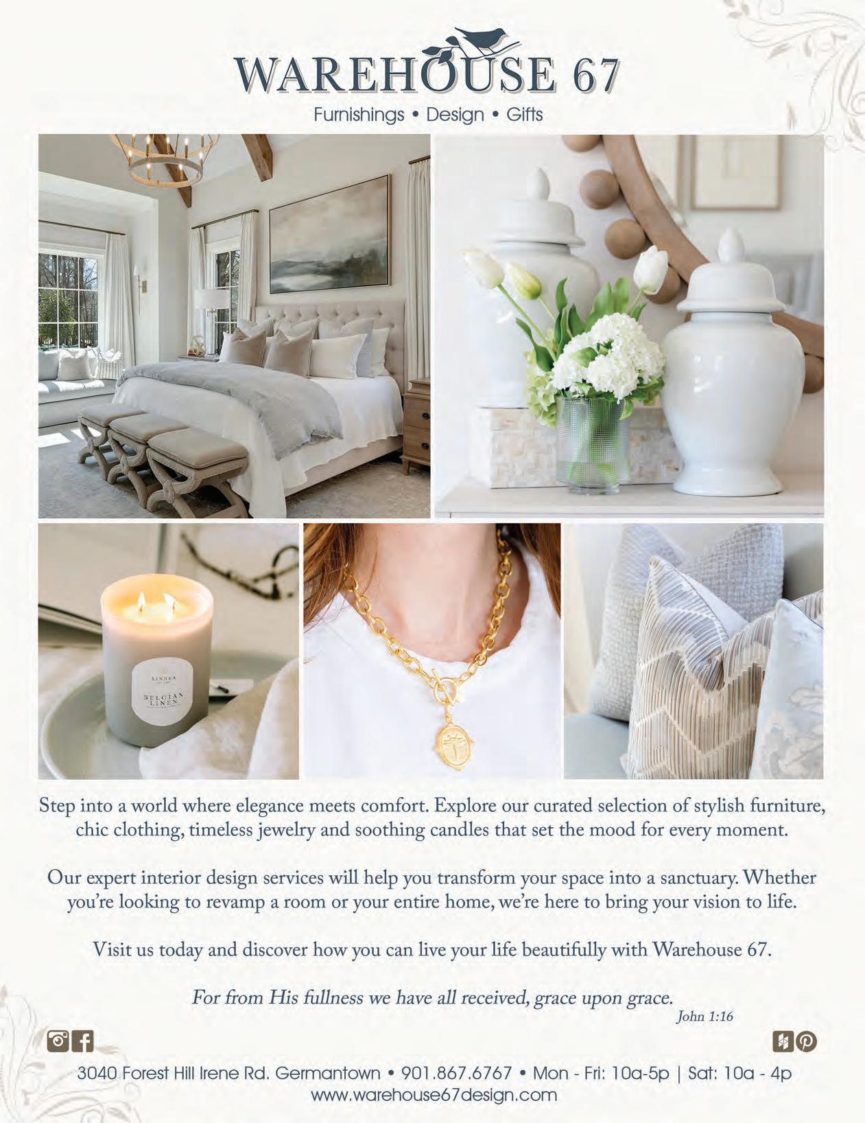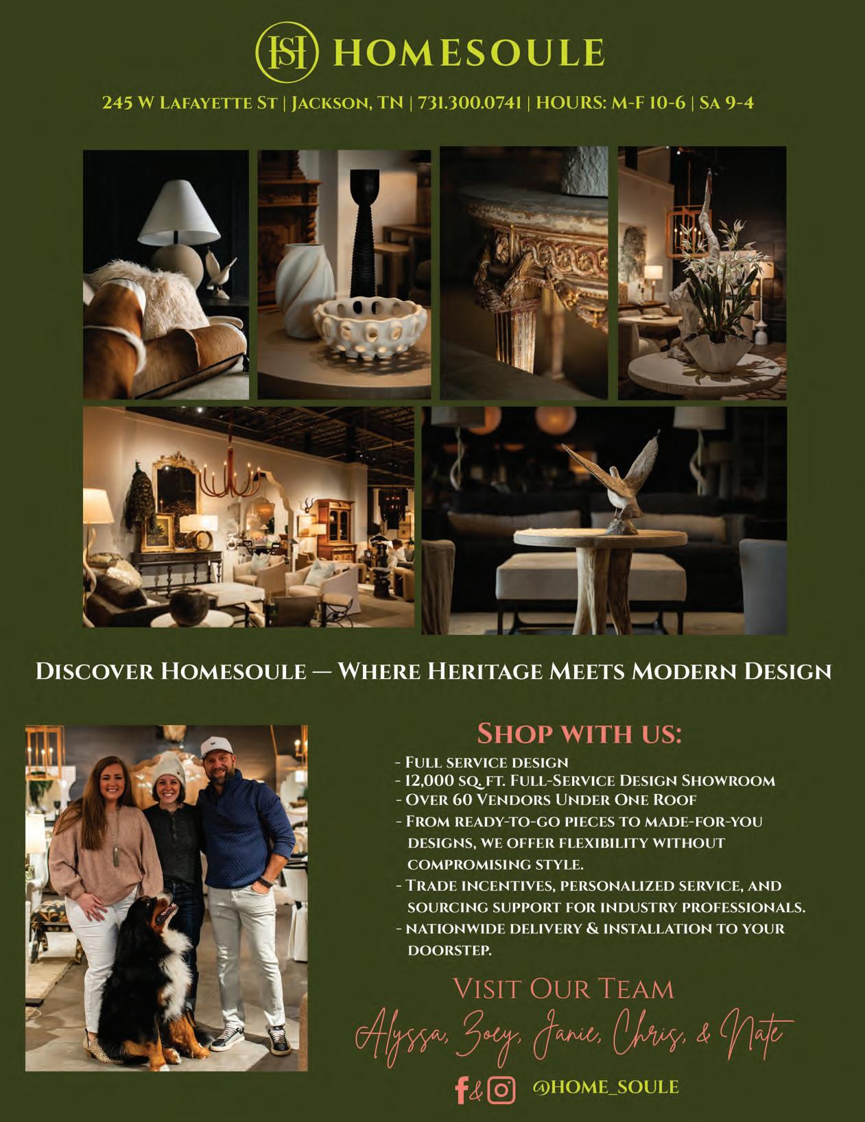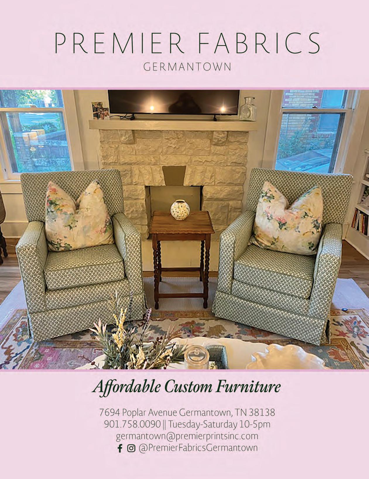 Call 901.684.4155 or subscribe at athomemms. com . Annual subscription rate: $19.95. Single copy price: $4.99. At Home Memphis & Mid South is published 12 times a year. Postmaster: Send address changes to At Home Memphis & Mid South , 7776 Farmington Blvd, #1321 Germantown TN 38183. We make every effort to correct factual mistakes or omissions in a timely and candid manner. Information can be forwarded to Trip Monger; At Home Memphis & Mid South , 7776 Farmington Blvd, #1321 Germantown TN 38183 or to tmonger@athomemms.com.