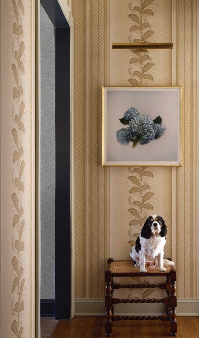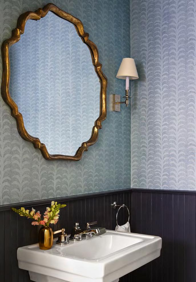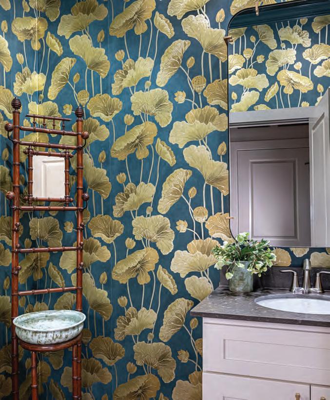 The home’s central hallway is now dressed up in classic Hydrangea Drape wallpaper from Schumacher, highlighted by more of Malmo’s favorite Farrow & Ball paint, here in a tranquil light blue. “Painting the trim a color can add warmth and richness to a home. It makes a house go from just walls and trim to inviting and comfortable,” she says. The color continues on the trim of the hall bath, paired with new wallpaper that evokes a not-so-new image. “It looks like the inside of an antique book,” the homeowner says.