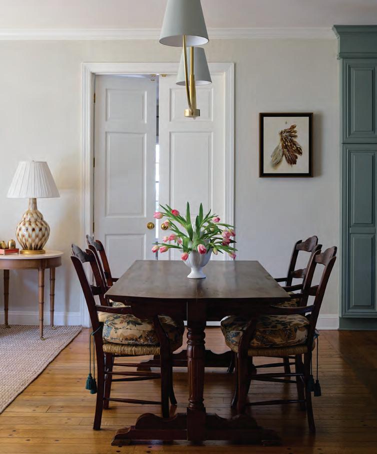 Theadjacent dining area is a seamless blend of old and new. Malmo only needed to add interesting design layers to the owners’ original pieces. She freshened up the ladder-back dining chairs with new cushions and tassel accents for a bit of British flair. Overhead, a graceful new light fixture adds simple elegance via its linear design.