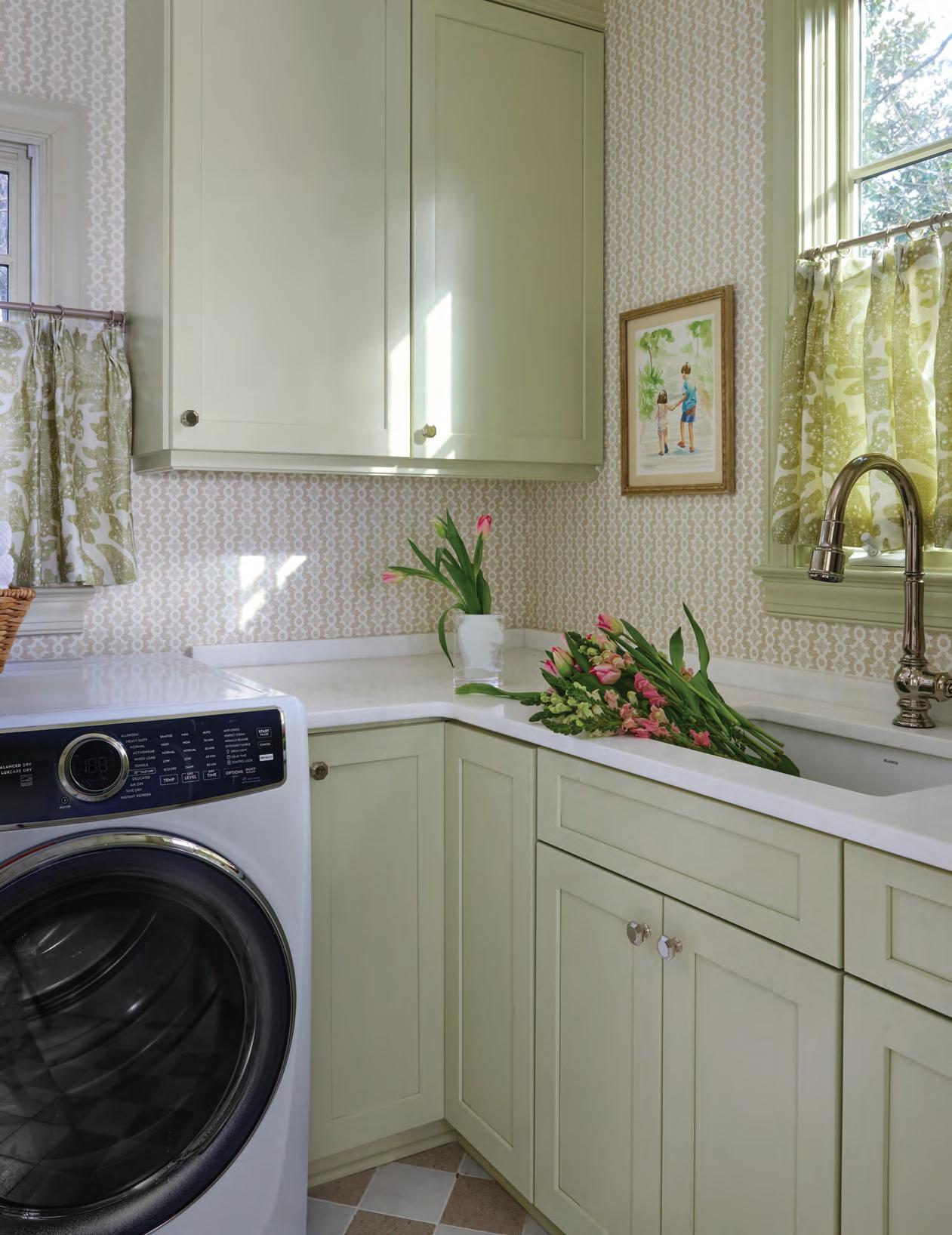 Justoff the kitchen, the formerly nondescript laundry room is now a cozy nook full of personality. Utility areas are often overlooked in renovation projects, and that was almost the case here. “I don’t think we were going to entertain the idea of touching it. Elizabeth asked us to trust her with it, and I’m so glad we did!” says the homeowner. The project manager from RKA Construction suggested leaving the cabinet boxes intact and replacing only the doors. That budget-friendly option tipped the scales in favor of the redo. New marble and travertine tile flooring sets the stage. “It’s Old World, but the scale of it feels fresh,” says Malmo. A traditional Dutch door, cheerful green paint and fresh white countertops combine to create the room’s charm. Small details like a vintage-style cutout pattern on the pantry cabinet doors add to the appeal. Says the homeowner, “It's just the happiest room. The whole family loves it.”