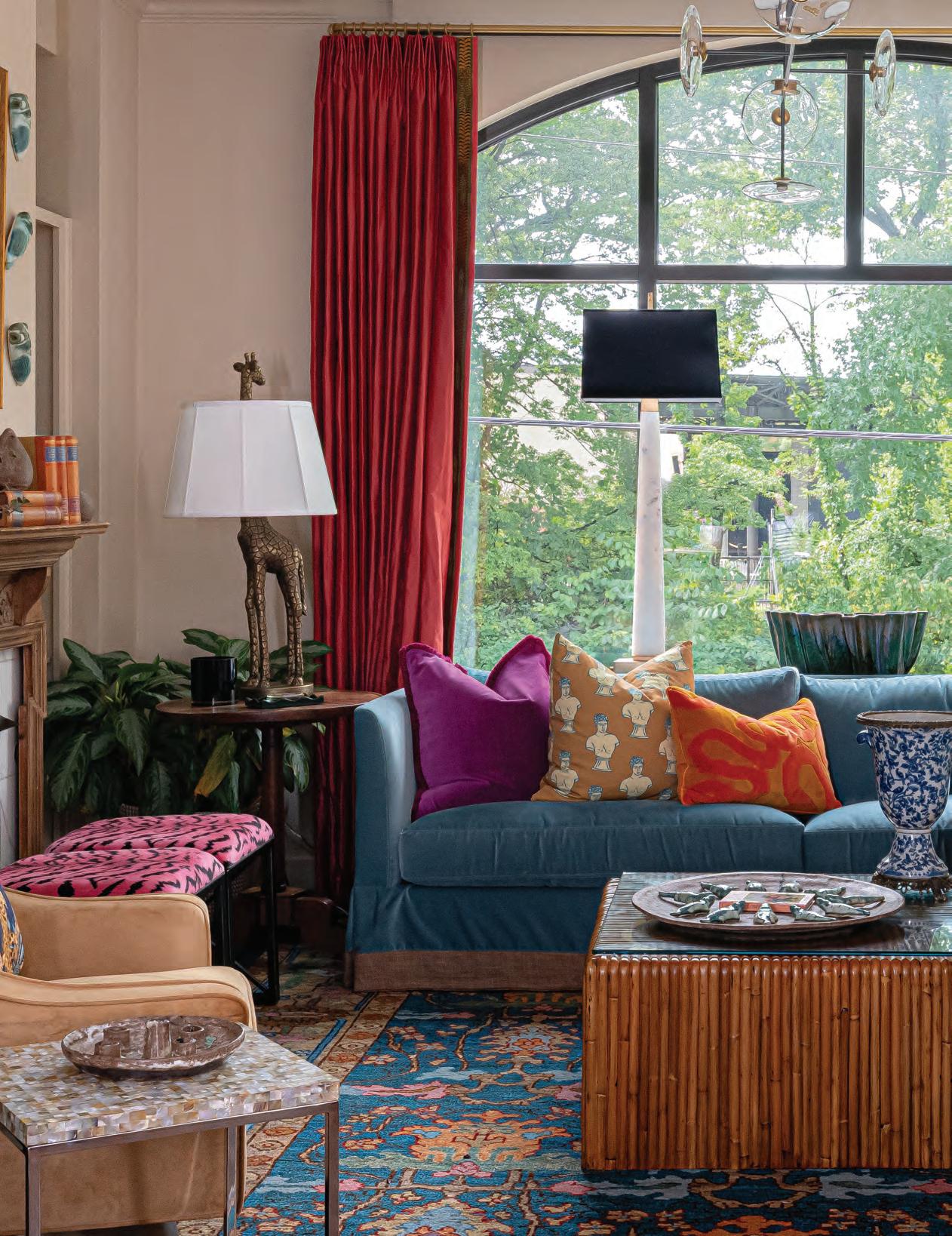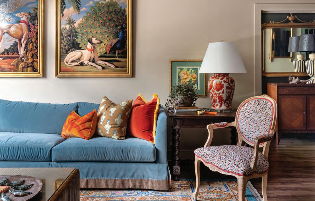 The entry leads to the unit’s open living/dining/kitchen combination. A pair of vintage greyhound paintings the client purchased from an estate sale served as the catalyst for the space’s color palette. Playing off the art’s tones, Phillips chose a rich Oushak rug, a deep blue velvet sectional and a sandy-toned suedecloth barrel chair. A pair of stools in front of the fireplace and a newly reupholstered Louis XVI chair up the pizzazz level, as do an assortment of colorful accent pillows and full-length dupioni silk drapes with tiger-print trim.