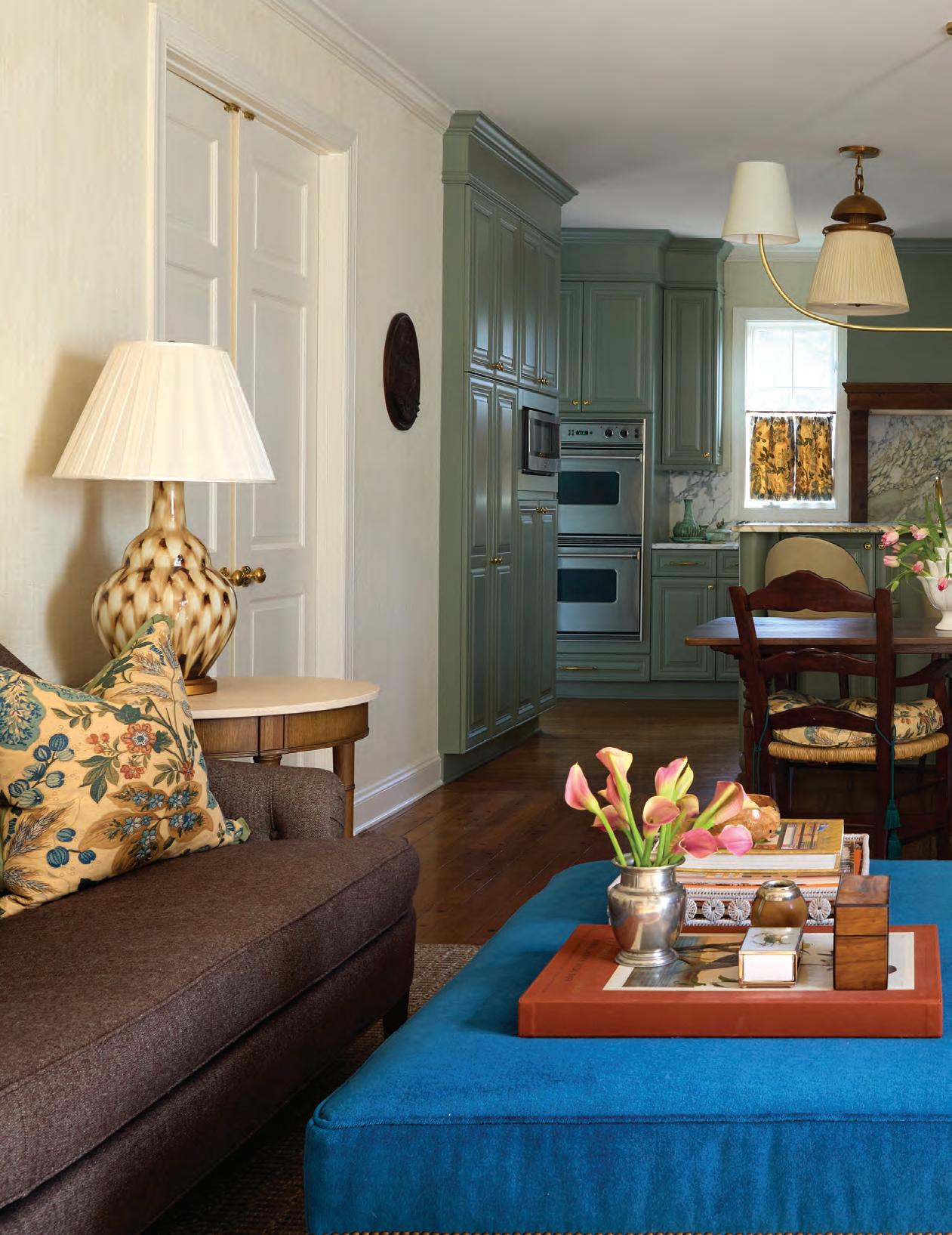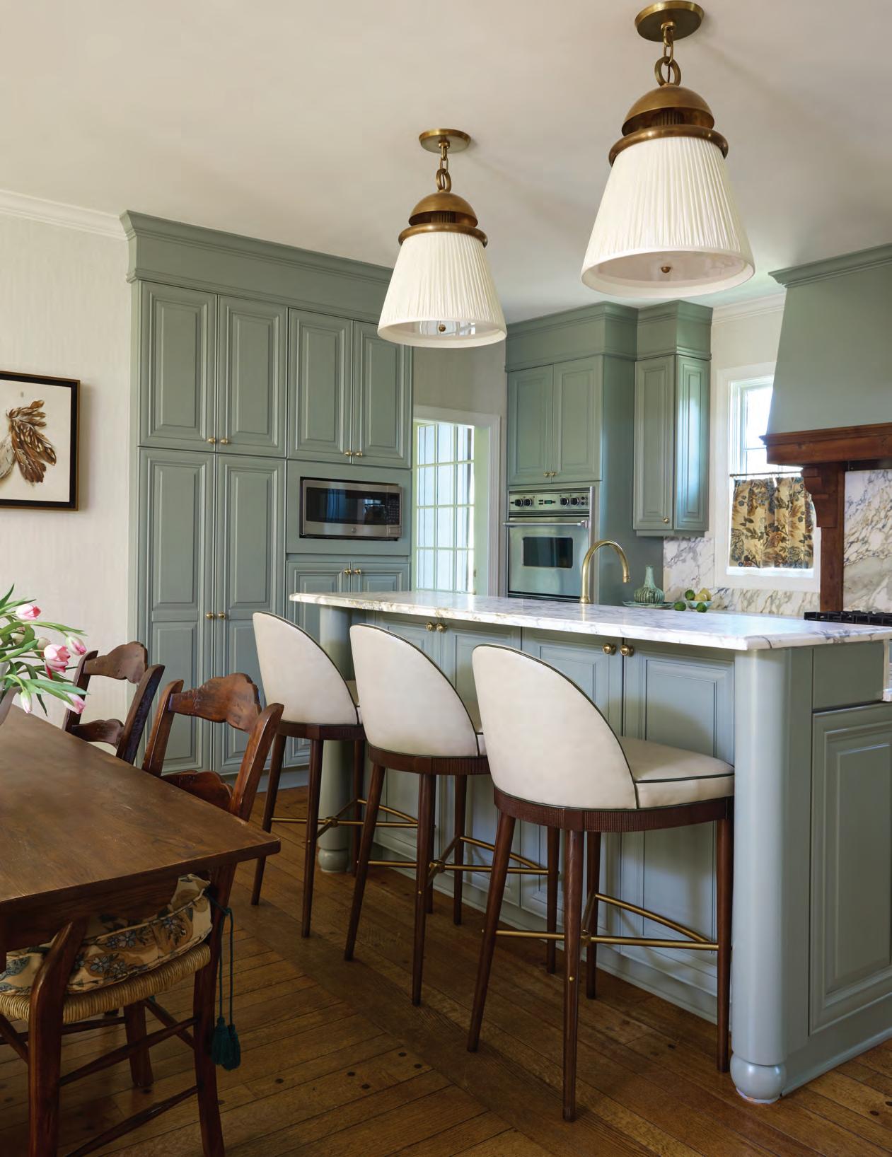 The existing kitchen cabinetry was top quality and in great shape, so it stayed in place, reimagined with Card Room Green, a deep yet muted gray/ green from English paint company Farrow & Ball. Finding the perfect stone for the countertops and backsplash entailed a lengthy search, but the homeowner and designer recognized it as soon as they laid eyes on it. “We stopped when we saw it and I said, ‘Elizabeth, there’s green.’ It’s just so perfect.” Indeed, the Calcutta Gold marble’s distinctive veining includes taupes, grays and a subtle green that reflects the cabinet color beautifully.