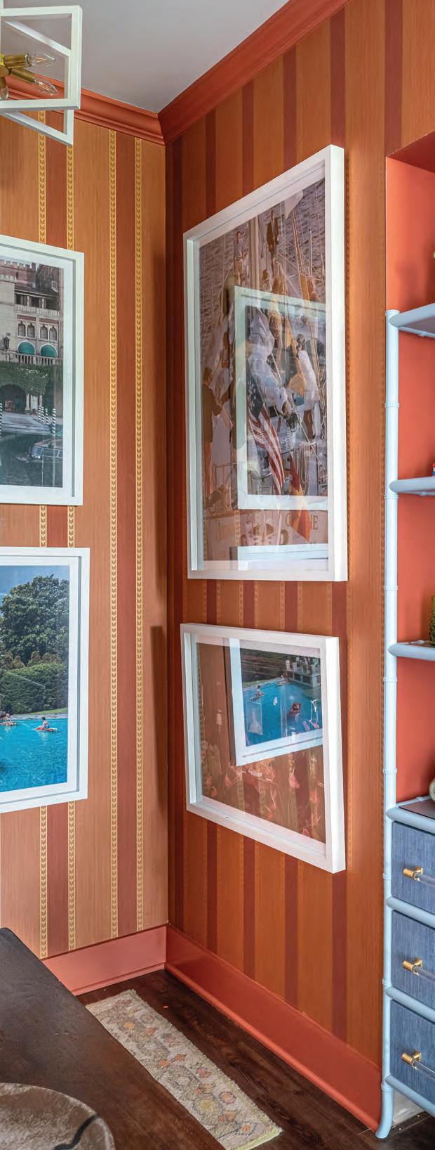 Turning a corner, vibrant striped wallpaper reflects the colors found in the series of Slim Aarons photographs that line the space. Phillips says her client was immediately drawn to the work of the late photographer who captured glamorous lifestyle images of mid-century socialites and jet-setters.